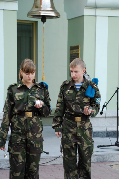 Юные воспитанники ЦВР «Галактика» вышли к колоколу в форме отряда спасателей с горящими свечами в руках.