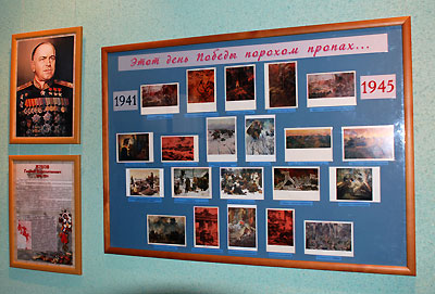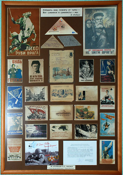 На стендах размещены коллекции П.П. Емельянова, С.В. Лаврикова, В.П. Лязгина, А.А. Хисамутдинова. В отдельной экспозиции представлена выставка художественных открыток новосибирского коллекционера С. Л. Тарновского, посвящённых Великой Отечественной войне. Среди них - картины О. Верейского "Василий Тёркин", В. Богаткина "Штурм Рейхстага", "У Брандербургских ворот", М. Самсонова "Сестрица", П. Кривоногова "Единоборство с танком", "Поединок (на Курской дуге)" и другие.