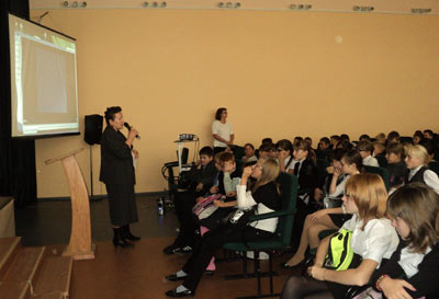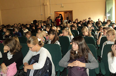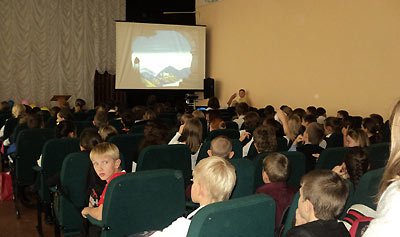 На следующий день праздник продолжился небольшим докладом и показом фильма "Поле Русской Славы". Основными зрителями были учащиеся с пятого по восьмой класс. Желающих не вмещал зал, пришлось повторять программу три раза подряд, и каждый раз в конце были вопросы и пожелания.