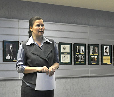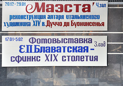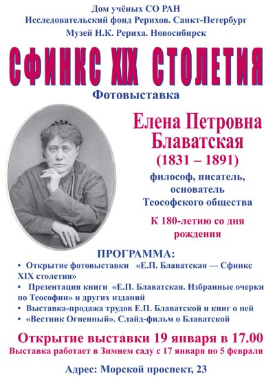 19 января 2012 года в Доме учёных СО РАН состоялось торжественное открытие выставки «Е.П. Блаватская - Сфинкс XIX столетия», представленной Исследовательским фонд Рерихов (Санкт-Петербург) и Музеем Н.К. Рериха в Новосибирске. Всех гостей, не побоявшихся прибыть в Академгородок в крещенские морозы, тепло поприветствовала заведующая сектором изобразительного искусства Дома учёных Ирина Викторовна Бич. Прозвучали сообщения Л.А.Ганиной (Сибирское Рериховское Общество), доклад «”Другое искусство» при свете теософии» искусствоведа Е.П. Маточкина. Были предоставлены книги, изданные в разных городах к 180-летию Е.П. Блаватской. Программу завершил слайд-фильм «Вестник Огненный» по слову Н.Д. Спириной. А в завершение встречи Ирина Викторовна провела гостей Дома учёных в конференц-зал, где сейчас размещена картина Н.К. Рериха «Победа».