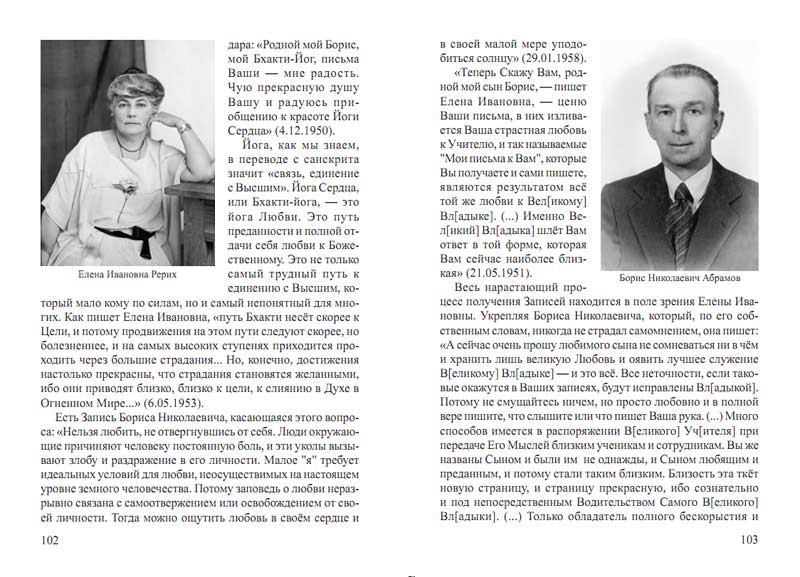 Бесценные Советы, объяснения, поддержка и ободрение — всё это мы имеем в его Записях, которые помогают нам в изучении книг Учения Живой Этики. В этих текстах немало строк обращено и к самому Борису Николаевичу: «Пиши. Пришло время действовать на плане земном». «Отныне Называю тебя носителем Моего Света. И свет, который в тебе, да будет светочем миру». Читая эти слова Учителя, мы можем только благодарить судьбу за то, что мы удостоены чести иметь через Наталию Дмитриевну такое близкое касательство к этому труду Бориса Николаевича Абрамова.