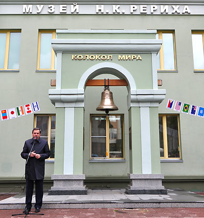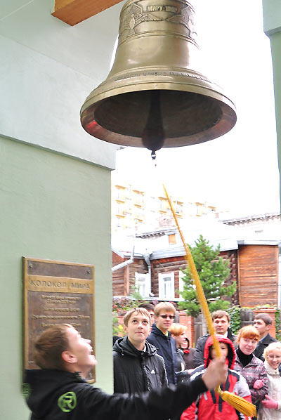 21 сентября — Международный день мира. У Колокола Мира при Музее Н.К. Рериха в Новосибирске прошло городское мероприятие. Перед собравшимися у колокола горожанами выступали мэр города В.Ф. Городецкий, председатель СО РАН А. Л. Асеев, руководитель представительства МИД РФ в Новосибирске Н.А. Афанасов, которые первыми сделали три удара в колокол,призывая всех подумать о мире. Звучала песня о важности сохранения мира, воздушные шарики с изображением голубя летели ввысь. После окончания церемонии ребята и взрослые выстроились в оживлённую очередь, всем хотелось приобщиться к всемирной традиции. Интересно наблюдать за лицами людей, ударяющих в Колокол Мира: казалось бы, каждый из них только что слышал этот звон и воспринимал его сдержанно. Но самые строгие и озабоченные лица вдруг изменяются, не удержав улыбки, в которой светятся различные оттенки счастья — иногда бурного, иногда умиротворённого или задумчивого. Видимо, что-то особенное всё же происходит в душе, когда ты стоишь прямо под колоколом, — недаром колокольный звон, разносящийся на большие расстояния, издавна считался целебным и приносящим гармонию.