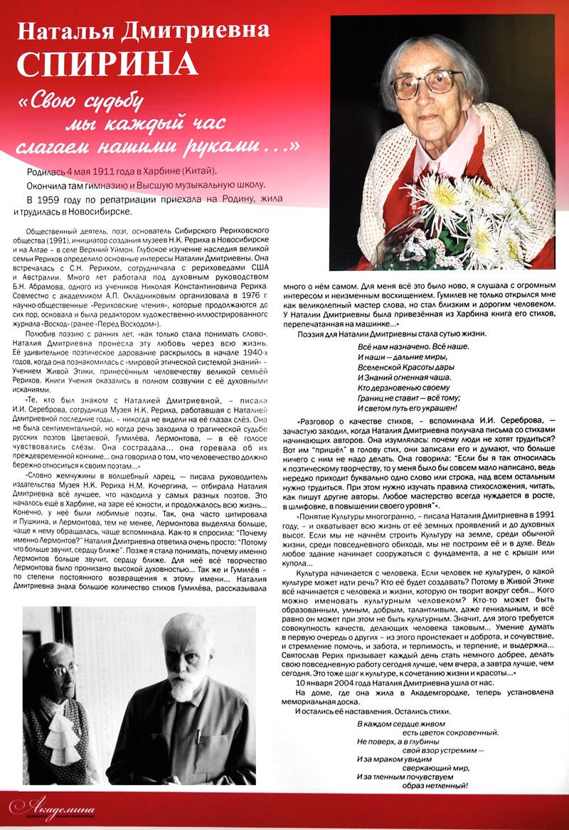 Вчера, 16 ноября, состоялось открытие выставки "Выдающиеся женщины Академгородка" в Зимнем Саду Дома Учёных СО РАН. Один из стендов посвящён Наталии Дмитриевне Спириной. Выставка организована Общественным фондом "Академгородок" при поддержке Сибирского отделения РАН, администрации Советского района Новосибирска и Дома Учёных СО РАН.