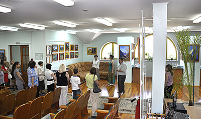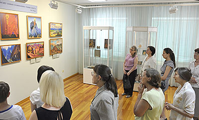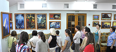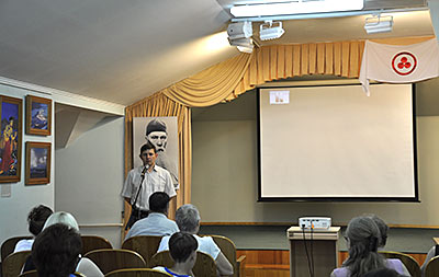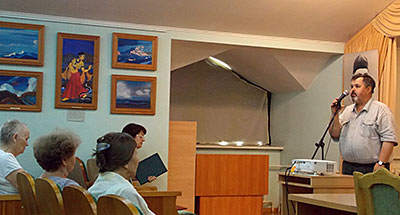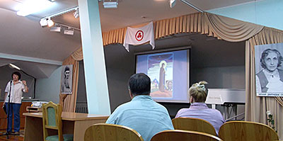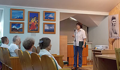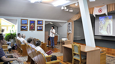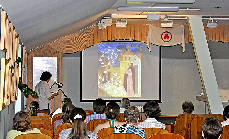 Вторая суббота июля в Музее Н.К. Рериха была посвящена приближающемуся Дню Преподобного Сергия Радонежского. 18 июля весь православный мир будет особенно вспоминать этого великого русского святого, отмечая "день обретения честных мощей преподобного Сергия Радонежского". Всегда отмечался этот день и в СибРО. В непростое время родился Сергий. Это были годы порабощения России Золотой Ордой и княжеских раздоров, которые уже несколько столетий тогда раздирали и обескровливали нашу родину. Великий строитель общинного жития и сотрудничества, он не просто поднимал и объединял Россию в борьбе за независимость, а строил новую страну, просвещая души людей. Н.К. Рерих в 1936 году писал о нём: "В труднейшие времена Преподобный Сергий, Воспитатель народного духа, строил сто монастырей – рассадников Просвещения. Этим даётся великий пример тому, что и в труднейшие дни можно насаждать свет и воспитывать дух человеческий. Ведь только в борьбе, только в самых несказуемых трудностях куётся несломимый клинок духа". И в наши дни, когда во весь рост встаёт вопрос о воспитании духовной культуры человека, великий образ Сергия как учителя, строителя общинного жития и сотрудничества живым примером зовёт нас в светлые дали будущего. В эту субботу гостям Музея были показаны посвящённые Св. Сергию слайд-программы «Светоч духовной культуры" (по выступлениям Н.Д. Спириной) и "Образ Святого Сергия в творчестве Н.К. Рериха" (по выступлениям и стихам Н.Д. Спириной). Сопровождался слайдами и рассказ о строительстве часовни Святого Сергия на территории Музея Н.К. Рериха. Гостья из Кемерово, Татьяна Павловна, вышла прочесть свои стихи, посвящённые Великому Строителю Земли Русской.