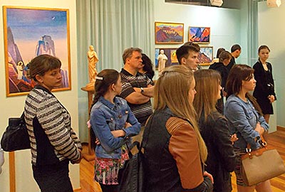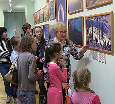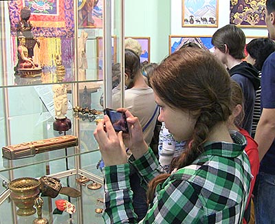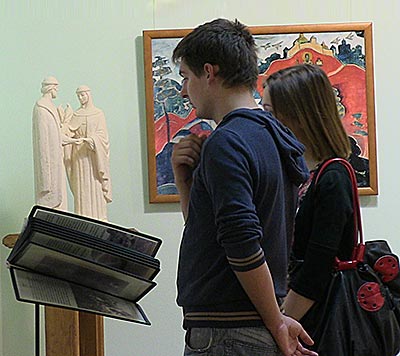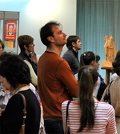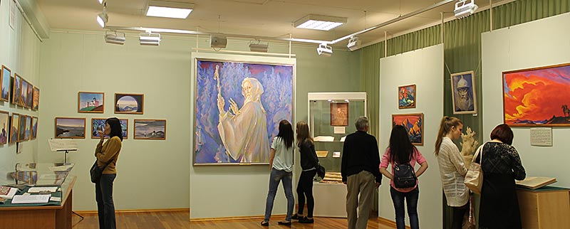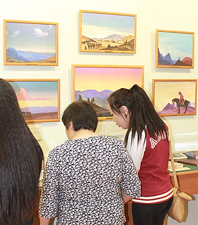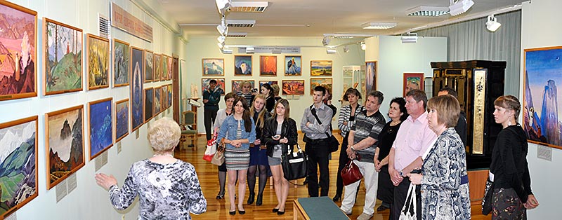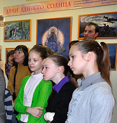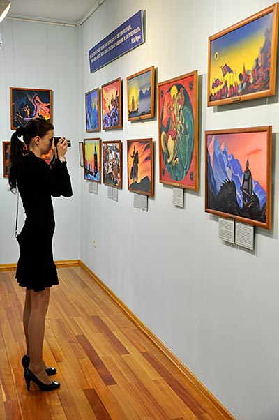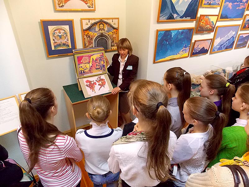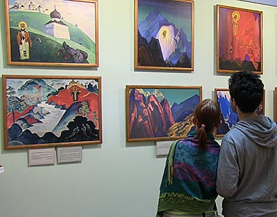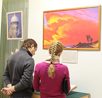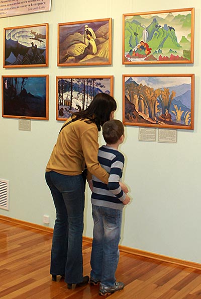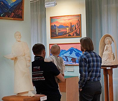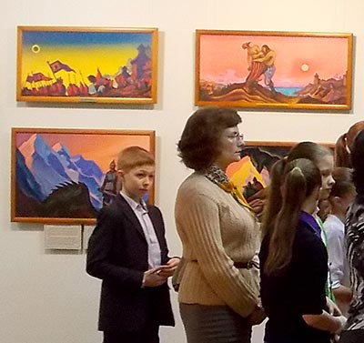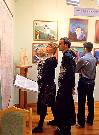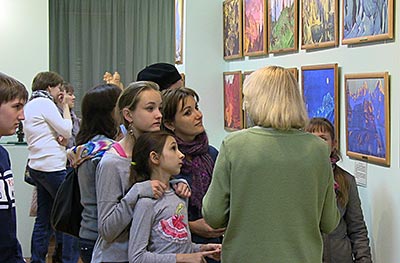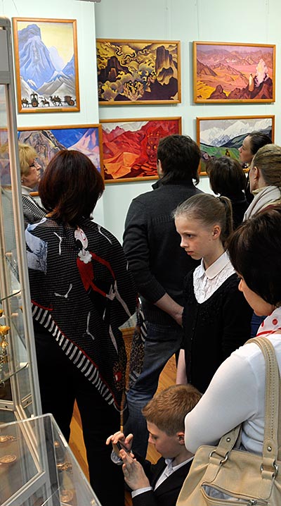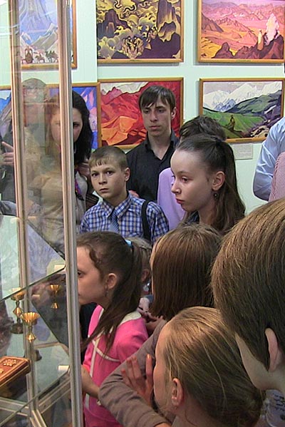 (окончание репортажа, начало здесь: Часть 1. Мастер-класс. * Часть 2. Концерты) В течение всего дня в выставочных залах Музея Рериха проходили экскурсии, для желающих демонстрировались различные фильмы студии СибРО. Постоянных посетителей также ждали недавно открывшиеся новые экспозиции: выставка графики Н.К. Рериха из частного собрания и выставка картины Леопольда Цесюлевича «Зов Преподобного», посвящённой Сергию Радонежскому. Среди гостей Музея было много школьников и маленьких ребятишек. Люди с интересом задавали вопросы, листали дополнительные материалы, кто-то подолгу размышлял у наиболее понравившихся экспонатов. С утра Музей посещали большей частью семейные группы, а ближе к вечеру потянулась вдумчивая и серьёзная молодёжь. Завершилась программа только в 22 часа. |