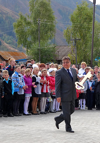 Сегодня, 12 сентября, происходит очень важное событие для жителей Верх-Уймона — открытие долгожданной новой школы. Это самое красивое и большое здание в селе, и оно сразу же обращает на себя внимание. Прежняя школа, очень маленькая и старая, построенная ещё в 1928 году и больше похожая на избу-читальню, как шутят сами учителя, уже не могла выполнять функции образовательной школы. Она пережила все разумные сроки, но дотянула до строительства новой. И за это свою старенькую школу и учителя, и ученики вспоминают с теплотой и лаской, благодарные за её терпение и долгую службу. И вот она, новая красавица-школа. Вольготно разместилась на краю села, заняла довольно большую территорию, уже изрядно благоустроенную. И чего здесь только нет: баскетбольная и волейбольная площадки, небольшой автопарк, своя котельная, овощехранилище. Строители очень постарались, чтобы к началу учебного года новая школа была готова к приёму учеников. Хотя многие сомневались, что такое возможно, глядя на то, какой огромный объём работ предстояло сделать к началу занятий. И строители сдержали своё слово. Сделали не только быстро, но и качественно! Этого события сельчане ждали давно – и вот этот момент наступил. Со всех сторон села идут к школе люди: школьники с цветами и в праздничной форме, их мамы и папы, бабушки и дедушки - спешат, боясь опоздать на самое важное для них мероприятие. Не могли обойти стороной это событие и мы, сотрудники Музея Н.К. Рериха в Верх-Уймоне. Радуемся вместе со всеми. Так уж сложилось, что дела наши тесно связаны с делами школы. Дружим давно: размещаем там выставки разных художников, фотовыставки окрестностей Уймона, Алтая, бываем на школьных мероприятиях, даже какие-то вопросы вместе решаем. И уже несколько лет в нашем Музее проходят беседы-занятия со школьниками, сопровождаются видеофильмами на самые разные темы: о героизме и подвиге, о любви к Родине, о смысле жизни, о роли Культуры в нашей жизни и так далее. А ещё в нашей мастерской работает кружок урало-сибирской росписи, причём выделенное под роспись помещение уже не вмещает всех детей, желающих учиться рисовать. Размещаем работы детей, оформленные в рамы, в школе, делаем выставку, которая становится гордостью всего школьного коллектива, ведь работы замечательные - и как талантливы дети, просто поразительно! Большой школьный двор гостеприимно принимает всех гостей. Настроение у всех очень торжественное, радостное. Звучат школьные песни, до боли знакомые нам, взрослым, наполняя нас воспоминаниями из далёкого детства, которые навсегда сохранились в глубинах нашего сердца, хотя и заглушаются жизненной суетой, заботами и проблемами. Школа — она как храм. Здесь хочется тихо постоять, разобраться в своих чувствах, сбывшихся и не сбывшихся надеждах. Вспомнить «свою» школу, учителей и одноклассников — мальчишек и девчонок, давно уже ставших степенными, пожилыми людьми. Ведущие объявляют о начале мероприятия, посвящённого открытию школы. Приветствуют гостей, благодарят всех, кто помогал, и благодаря чьим усилиям появилась эта замечательная школа. Наступает самый волнующий момент. Игорь Миронович Ким, Генеральный директор строительной организации ООО «ФундаментСпецПроект», которая занималась строительством этого прекрасного объекта, торжественно вручает символический ключ от дверей школ