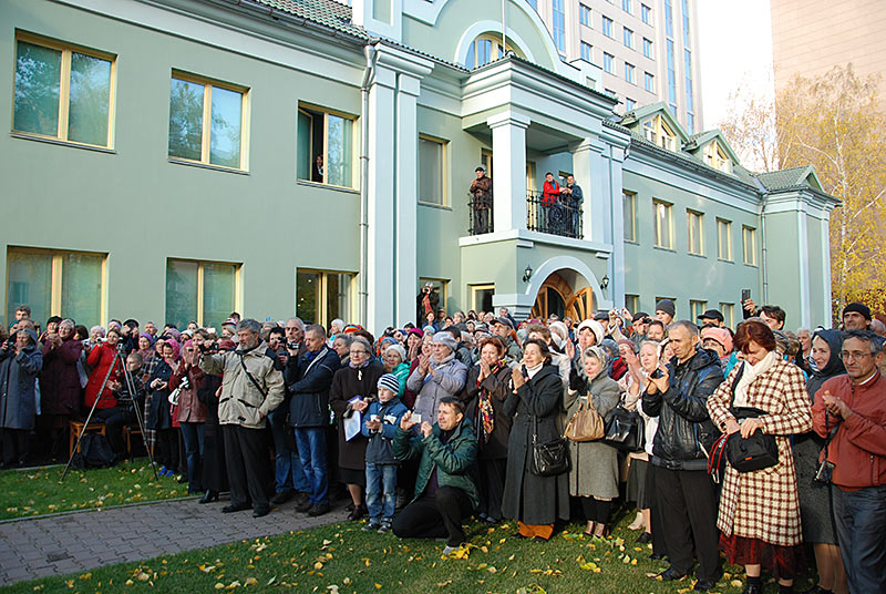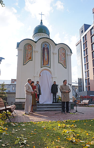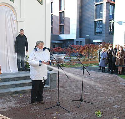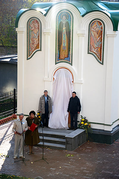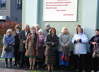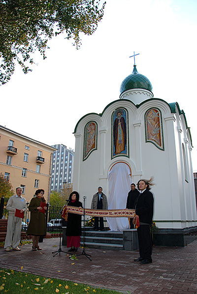А.А. Бондаренко, директор Санкт-Петербургского Государственного Музея-института семьи Рерихов:Дорогие друзья! Нет слов, чтобы выразить те чувства радости, которые пронизывают наши сердца при виде этого замечательного Мемориала. Огромная работа, произведённая вами под продолжающимся руководством Наталии Дмитриевны Спириной, не имеет цены. То, что вами сделано, — сделано на века. То, что вами делается, — делается для людей, а не для собственного возвеличивания. Сегодня, в год 700-летия, мы лучше осознаём те ориентиры, которые вложил в наши с вами сердца Преподобный Сергий Радонежский. Этот Мемориал будет маяком для многих и многих людей, живущих в Новосибирске, а также приезжающих сюда. Я вас сердечно поздравляю с открытием Часовни, и я верю, что здесь, стоя вместе со всеми, мы чувствуем истинное сердечное единство. Это единство добыто многими столетиями. Спасибо вам огромное! Мария Скачкова, президент организации «Звёзды Гор»:Дорогие друзья! Мы с вами — участники великого события, открытия часовни Преподобного Сергия Радонежского, Строителя русской духовной культуры и Небесного Защитника земли Русской. Для нашей организации «Звёзды Гор» это огромная радость и великая честь, и сердце полно благодарности строителям, всем тем, кто участвовал в создании этого огненного терафима. Уважаемая Ольга Андреевна, сотрудники Сибирского Рериховского Общества, искренне поздравляем Вас с построением храма Сергия. Низкий поклон всем вам за ваш воистину жертвенный труд! Сегодня, когда мир оказался на краю пропасти, вы воздвигли твердыню духа, вселяющую в сердца человеческие надежду и веру в Победу Света и Добра. Сказано: трудом оправдаетесь и действием вознесётесь. Вы построили Музей Рериха в Новосибирске и Верхнем Уймоне, ваш Колокол Мира призывает к дозору, к охране мира и культуры, нравственных ценностей человечества. В «Листах Сада Мории» Учитель говорит: «Необходима жертва — горение жертвы подобно озону». Эти слова были сказаны о Елене Ивановне и Николае Константиновиче — они принесли великую жертву, положили на алтарь служения всю свою жизнь, без остатка. Все их мысли и труды были посвящены созиданию Дел Учителя. Эта жертва позволила им построить Институт объединённых искусств, Музей Рериха, Институт «Урусвати» и дать миру Учение Жизни — Живую Этику. Безусловно, труд СибРО во имя Учителя является успешным и плодотворным, потому что вы всецело посвящаете себя служению благу. И мы уверены, что впереди у вас ещё множество прекрасных и светлых дел! Дорогие друзья! В этот торжественный, знаменательный день всем сердцем хочется пожелать планете мира, добра, любви и красоты. Пусть часовни и храмы Сергия Радонежского, Великого Учителя Человечества, возводятся по всей нашей земле, защищают и вдохновляют на подвиг во имя Жизни, во имя Знания и Красоты! Пусть объединятся люди всего мира, дабы, по завету Преподобного, победить ненавистную рознь мира сего! И да поможет нам в этом Святой Сергий!