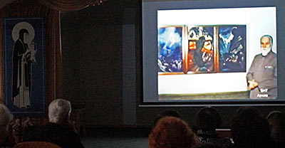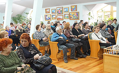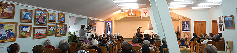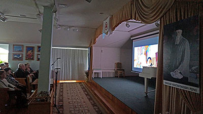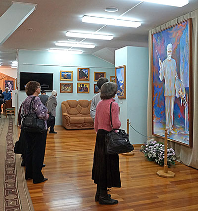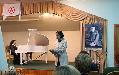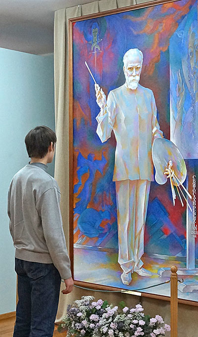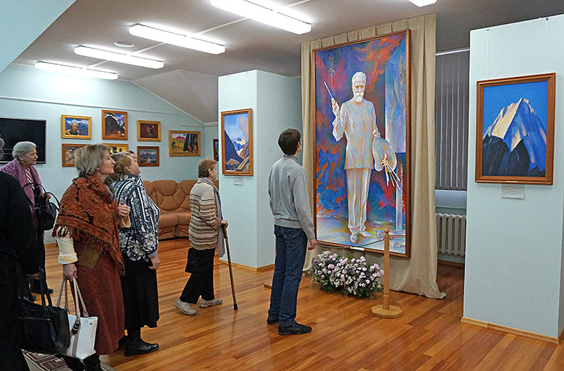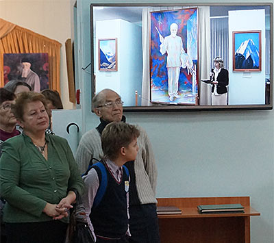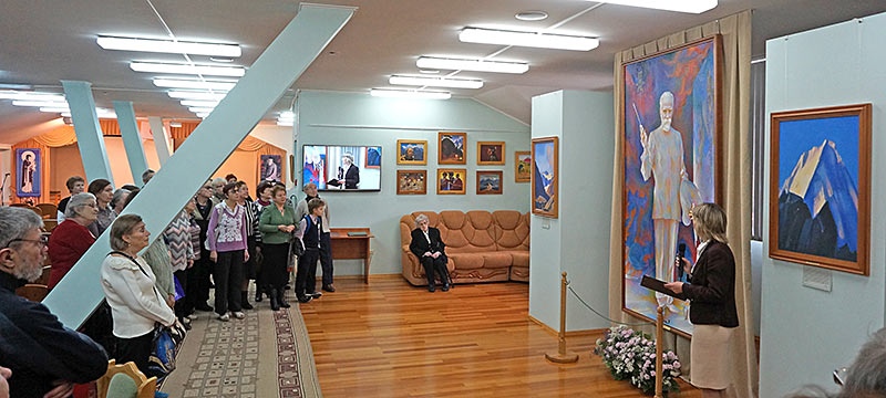 Праздник начался с открытия картины-портрета, как назвал своё произведение сам мастер, художник, написавший эту картину и близко знавший С.Н. Рериха — Леопольд Романович Цесюлевич. Портрет Святослава Николаевича — это уже четвёртая картина, подаренная автором нашему Музею. Каждый раз получение такого бесценного дара — это огромное событие для нас. Выставку открыла Л.А. Толстихина. Она рассказала о картине: «Святослав Николаевич изображён в своей мастерской на фоне картин, которые хорошо нам знакомы. Это грозные картины, предупреждающие об опасностях, нависших над человечеством, призывающие увидеть, оценить и отвести эту угрозу, призывающие обратиться к Добру, Любви и Красоте. В этом призыве - «Воззри, человечество!» - Л.Р. Цесюлевич видит главную идею всего творчества С.Н. Рериха. Но, несмотря на такой тревожный фон картины, сам Святослав Николаевич, его облик воспринимается ободряющим, светло улыбающимся. Взгляд его обращён к каждому, он смотрит в глаза и как будто произносит слова, самые важные, самые нужные именно для этого человека и именно в этот момент. Кому-то он, может быть, говорит так: «Главное — нужно быть сильными, уверенными. И в чём? — В самих себе! Мы не должны поддаваться всевозможным призракам мира нашего. Мы должны делать то, что мы сочли правильным, и быть сами примером другим». Это слова Святослава Николаевича из беседы в Москве в ноябре 1982 года. Для кого-то нужны слова, побуждающие к действию, и Святослав Николаевич говорит ему: «Мы всегда должны пытаться действовать, какой бы трудной ни была задача, какими бы непреодолимыми ни казались препятствия. Каждое отступление должно восприниматься как передышка перед более значительным усилием и более значительным достижением. Мы не должны пренебрегать жизнью, а использовать её на то, чтобы стать более совершенным человеком. … Мы должны жить и трудиться в жизни там, где мы нужны, там, где мы можем принести наибольшую пользу, там, где в нас нуждаются и где, в конце концов, и есть лучшая возможность для применения наших знаний, нашего опыта». А кому-то помогают изменить взгляд на жизнь, посмотреть на неё более оптимистично такие слова: «Повседневную жизнь можно превратить в исключительно захватывающее приключение, полное открытий и новых уроков, взамен безотрадной, утомительной рутины, полной досадных мелочей и суеты. Нам нужно стараться решать проблемы жизнерадостно и заинтересованно. Видеть в каждой проблеме некий урок, новый опыт. Нечто такое, что нужно преодолеть и от чего в то же время можно научиться». И каждое сердце отзывается на призыв С.Н.Рериха к поиску Красоты в жизни: «Стремление к Прекрасному должно стать для нас нормой каждодневного отношения к жизни. И в этом стремлении мы сможем наиболее полно выразить себя. Давайте будем стремиться к тому, чтобы наши поиски Прекрасного стали нашим каждодневным опытом. Давайте будем стараться находить красоту во всех наших каждодневных обязанностях, ведь даже самую маленькую задачу можно выполнить красиво». Для каждого у Святослава Николаевича находятся нужные слова, которые помогают разрешить какие-то трудные вопросы жизни, устоять в тяжёлой ситуации, разобраться в себе, вселяют уверенность. Мы находим эти советы, подсказки, эту поддержку в выступлениях Святослава Николаевича, в его книгах. Мы слышим их сердцем, ког