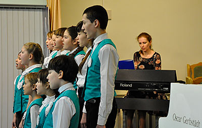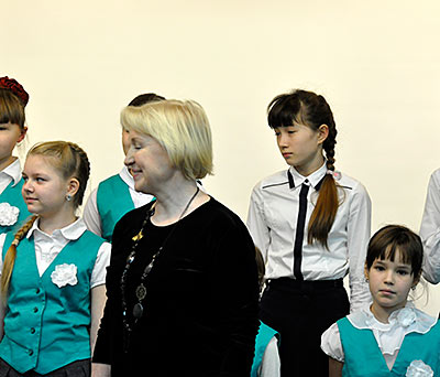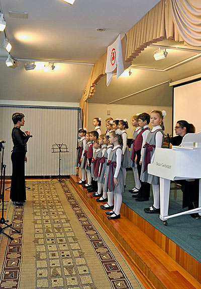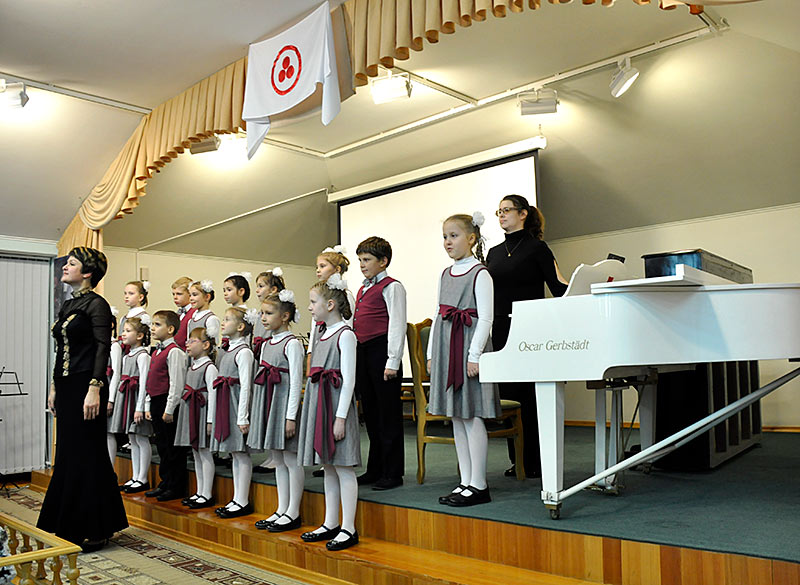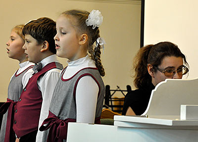 Иоганн Себастьян Бах с детства пел в детском хоре. Когда он жил в Люнебурге, учился в певческой школе мальчиков - вокальной школе Св. Михаила. А когда служил в церкви Святого Фомы в Лейпциге, одновременно исполнял и должность органиста, и должность кантора церковного хора, а также руководил детским хором в школе церкви Святого Фомы. Конечно, в его хоре пели мальчики. Когда в хоре запела его первая жена Барбара, это вызвало огромное негодование у зрителей. Считалось, что женщинам петь нельзя, потому в хоре все сопрановые партии исполняли детские голоса — мальчики. Их чистые, высокие, звонкие голоса напоминали ангельское пение. У нас сегодня в программе есть такие маленькие ангелочки, и я их сейчас приглашаю на сцену. Это младший хор детской школы искусств № 18. Руководитель хора — Ольга Викторовна Чернышёва, концертмейстер Юлия Александровна Савченко. Споют наши ангелочки песню Баха «За рекою старый дом». Кстати, я хочу добавить, что хор мальчиков в церкви Св. Фомы существует по сей день…