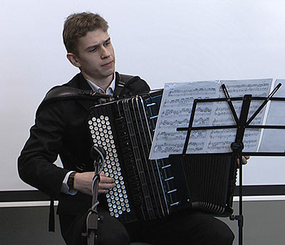 Наша программа открылась фрагментом первого номера рождественской оратории Иоганна Себастьяна Баха. Таким образом И.С. Бах поздравил всех нас с прошедшими только недавно новогодними праздниками и Рождеством. Род Бахов был известен своей музыкальностью с начала XIV века. Очень многие предки, родственники Баха были профессиональными музыкантами: скрипачами, флейтистами, пианистами, трубачами. Иоганн Себастьян умел играть практически на всех музыкальных инструментах, которые в то время существовали: и орган, и флейта, и скрипка, и лютня, и другие. На скрипке научил его играть отец, это был, пожалуй, первый инструмент, на котором он научился играть. Но самое первое сочинение Баха всё же было написано для органа. В то время Иоганна Себастьяна его больше знали как органиста-виртуоза и совершенно не воспринимали как композитора. Сейчас я приглашаю на эту сцену артиста оркестра народных инструментов новосибирской государственной филармонии под управлением Владимира Гусева — Дмитрия Тимофеева. Сейчас На баяне прозвучит Органная фантазия ля минор Иоганна Себастьяна Баха. |