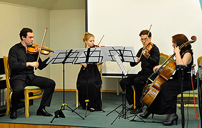 А сейчас на нашей сцене окажется шесть человек. Кроме того, что Бах был великим музыкантом, органистом, композитором, он был очень религиозным человеком. С 15 лет, оставшись без отца и матери, он пошёл в церковь, которая его приютила, дала ему кров, хлеб, работу, и всю жизнь Бах был невероятно предан и верен Богу. Для него все евангельские числа имели большое значение: цифра 3 означала Троицу, 12 — апостолов, цифра 6 — сотворение мира за 6 дней. И потому некоторые его сочинения — это циклы из шести произведений. А сейчас прозвучит Двойной клавирный концерт И.С. Баха до минор, который написан для двух клавиров и струнного оркестра. В качестве струнного оркестра у нас будет звучать 4 инструмента. Приглашаю струнный квартет «Фаэтон»: Семён Промое, Анна Новожилова, Галина Майорова, Геннадий Ерёменко. |