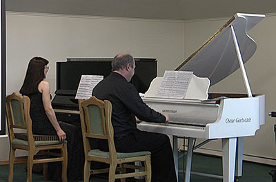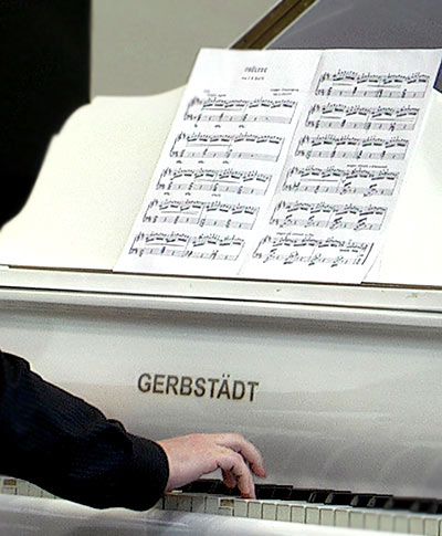 Сам Бах говорил: «Вся моя музыка принадлежит Богу, и все мои способности ему предназначены». Возможно, именно Баху было позволено услышать музыку небесных сфер и обнародовать её. Потому мы говорим, что музыка Баха возвышает, она бесконечно мудра и недосягаема, как Вселенная. Так вот, особый вклад в признание величия Баха находится в Космосе, за тысячи миль отсюда. В 1977 году в Космос был запущен американский спутник «Фоледжер», на борту которого находится золотой диск с музыкой И.С. Баха. Это значит, что если вдруг где-то есть другие, внеземные цивилизации, то первым, что услышат они, знакомясь с нами, землянами, будет музыка И.С. Баха. Сейчас прозвучит вторая часть Бранденбургского концерта № 1. Музыка эта написана для оркестра, но мы исполним её в переложении для фортепиано в четыре руки.