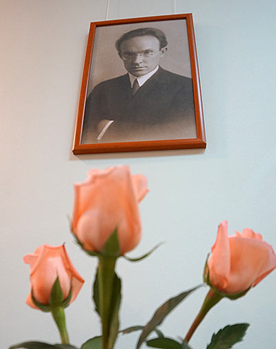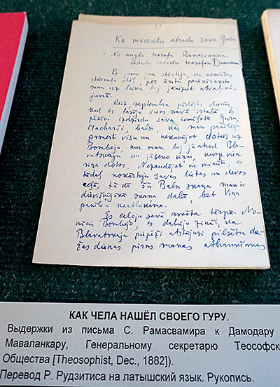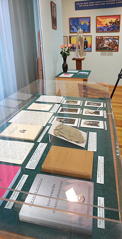 Рихард Рудзитис родился 19 февраля 1898 года в Латвии на берегу Балтийского моря в семье бедных крестьян. Он сам учился читать, и книги стали его большими друзьями на всю жизнь. Рихард покупает их на свои деньги, продавая собранные в лесу ягоды и грибы. Читает тайком – в сумерках, рано утром, поздно вечером. Рано портится зрение. Нередко родители его наказывают, ведь читать, по их мнению, значит лениться. С малых лет Рихард начинает писать стихи, а с 12 лет ведёт дневник. Очень рано задумывается о вечных вопросах. В 9 лет он пишет письмо Льву Толстому, позже – Рабиндранату Тагору и Ромену Роллану. Радуется, когда последние ему отвечают. Окончив местную гимназию, он продолжает образование в старинном Дерптском университете. Во время Первой мировой войны Рихарда призывают в армию, он чудом остается жив. После демобилизации в 1920 г. поступает на философский факультет Латвийского университета и начинает работать в Национальной библиотеке. В витринах вы можете увидеть портреты молодого Рихарда Яковлевича. На одном из портретов ему 22 года. В начале 20-х гг. в печати появляются стихи, статьи, рецензии Рудзитиса. В 1922 г. выходит первый сборник его стихов – «Песни человека». Он есть в нашей экспозиции. В дневнике 8 марта 1922 г. Рудзитис записывает: «Наконец свершилось. Вчера вышли мои стихи «Песни человека». Много было забот, пока все приготовил. И теперь все просто. Так лучше. Белая обложка, зеленые буквы. Без рисунка. И сегодня я начинаю дарить многим…О Боже, сколько сражений вложено в эти стихи! Каждая строчка написана кровью моей души». В 1925 г. появляется второй сборник стихов «В храме. Песни о любви». Он тоже есть в нашей экспозиции. Всё больше и больше Рудзитиса начинают привлекать восточная философия и поэзия. Он переводит стихи Саади и Руми, Тагора, труды Вивекананды, Бхагавадгиту. В экспозиции есть книга переводов Тагора на латышский язык 1977 г. издания.