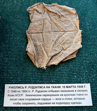 Это тот предмет нашей выставки, на который невозможно смотреть без сострадания и восхищения мужеством Рихарда Яковлевича – кусочек ткани с текстом его рукописи, сделанным в лагере. 15 марта 1949 г. Огромной радостью для Р.Рудзитиса стали его встречи с Юрием Рерихом, вернувшимся на родину в 1957 г. О них подробно рассказывается в дневниковых записях и воспоминаниях Рихарда Яковлевича. На вершине своего жизненного пути Рудзитис пишет работу «Учение Огня. Введение в Живую Этику», подводя итоги своего изучения Агни Йоги. Он заканчивает книгу в последний месяц своей жизни (в октябре 1960 года). В экспозиции книга на латышском языке 2008 г издания. Рихард Яковлевич ушёл из жизни посреди дел и работ — его сердце не выдержало горькой вести о внезапном уходе Ю.Н. Рериха. Похоронен Р.Я.Рудзитис на Лесном кладбище в Риге. На гранитном камне, повторяющем форму пламени, высечена пламенеющая чаша воителя Грааля, а под нею слова: «Спеши к утру».