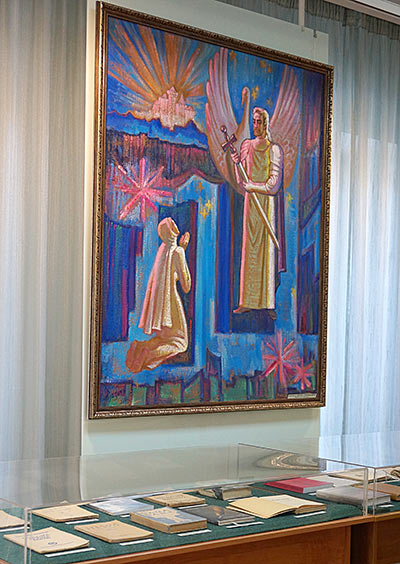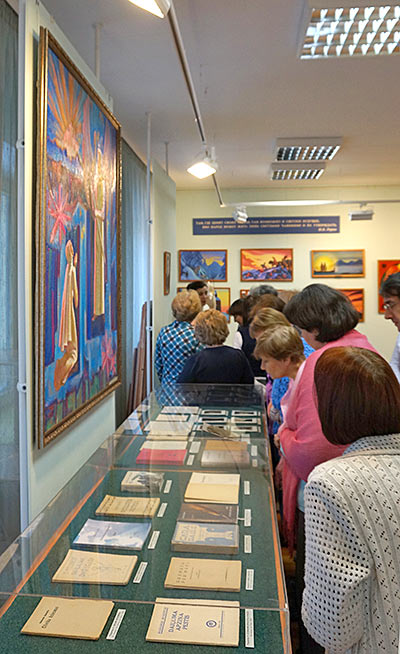 В конце 20-х гг. Латвийское общество Рериха приглашает Рудзитиса - как чуткого переводчика и знатока восточной культуры - стать редактором переводов книг Агни Йоги. Когда в 1930 г. Общество официально регистрируется, он уже является одним из его активных членов. Рудзитис находит то, что искал многие годы. В дневниковой записи от 1 февраля 1928 г. мы читаем: «…Лукин мне дал «Тайное учение» (видимо, «Тайную доктрину» Блаватской) и другие чудесные книги, и я шел домой с таким ликующим, ликующим сердцем». А вот запись от 18 марта того же года: «Впервые прикоснувшись к теософии, я вошел в неё и чувствую себя в ней как дома. Там я нашел готовым все то хорошее, что я несколько лет черпал из индийской философии и религии». В витрине находится интересный документ – это текст рукописи, перевода Рудзитиса на латышский язык "Как чела нашел своего Гуру", это выдержки из письма С.Рамасвамира к Дамодару К. Маваланкару, Генеральному секретарю Теософского Общества [Theosophist, Dec., 1882]. Появление Латвийского общества Рериха связано с именем рижанина Владимира Анатольевича Шибаева, который ещё осенью 1919 года знакомится с семьёй Рерихов в Лондоне. Николай Константинович Рерих уже тогда останавливает выбор на нём как на своём секретаре. На выставке вы можете увидеть Письмо Н.К. Рериха В.А. Шибаеву от 3 сентября 1924 г из Дарджилинга. Оно написано рукой Н.К. Рериха на одной странице широкого листа в линейку и подписано монограммой РХ. С 1930 г. 6 лет председателем Латвийского общества Рерихов был Ф.Д. Лукин. После его смерти в 1936 г. председателем единогласно избирают Р. Рудзитиса, который руководил обществом до 1940 г. Также в его ведении было издательство «Угунс». Рерихи полностью доверяли вкусу и опыту издателя Р.Рудзитиса, отсылая в Ригу рукописи Учения Живой Этики, дневники Николая Константиновича, перевод «Тайной Доктрины». Всего в те годы было издано около 50 книг. Рудзитис продолжал работать и над своими книгами. О работе над книгой «Н. Рерих — водитель культуры» (1935) он пишет: «Ещё ни одну книгу я не писал в таком великом напряжении, как эту. И с самым большим чувством ответственности. Напряжение это длилось 4 месяца». Эта книга представлена на нашей выставке. «Сознание красоты спасёт» (1936). Об этой книге лучше не скажешь, чем это сделала Е.И. Рерих в своем письме к Р.Я. Рудзитису от 10 октября 1936 года: «Родной наш Рихард Яковлевич, вчера нам радость, пришла Ваша чудесная книга "Сознание Красоты спасет". В тот же вечер мы прочли этот огненный гимн Красоте. С восторгом вчитывались в эти одухотворенные строки. Столько в них сердечного огня! Столько Света, бодрости и радости! Книга эта должна найти место на столе правителей, в школах и в каждом обиходе. Ведь она говорит о самом насущном, о том, чем жив человек! Хотелось, чтобы она проникла и туда, где начинают мечтать о внесении красоты в жизнь». Книга на латышском языке находится в витрине. Также здесь помещена фотография Рихарда Яковлевича за рабочим столом во время работы над этой книгой. Книга «Братство Святого Грааля» была издана только в 1994 г. Но ещё в 1936 году Е.И. Рерих писала Рудзитису: «Считаем, что книга эта не только полезна, но именно необходима. Мы всегда опасались и опасаемся, когда затрагивается в печати высочайшее понятие Иерархии-Света, но Вам мы вполне доверяем, ибо Ваше чувство Красоты и присущая северным народам чистота 