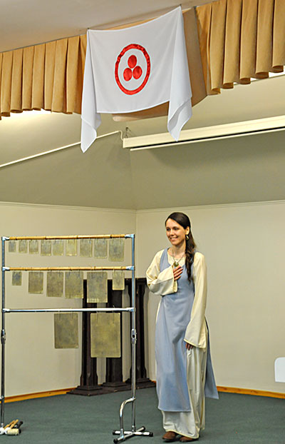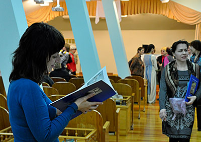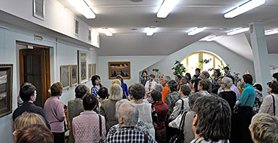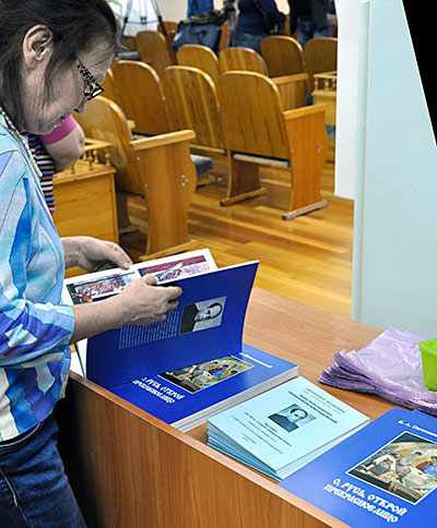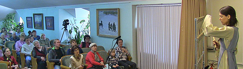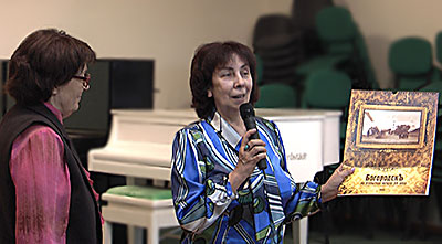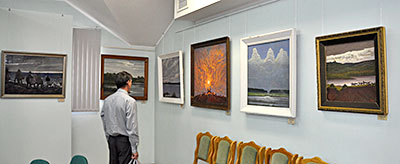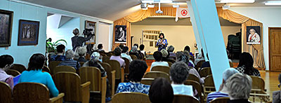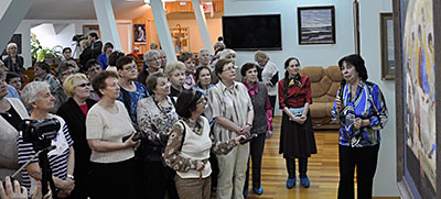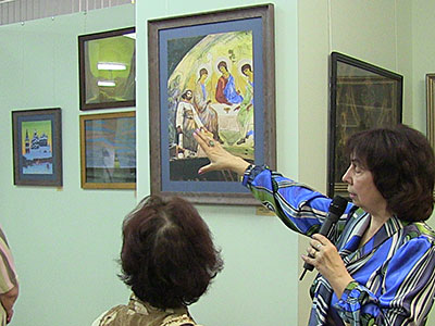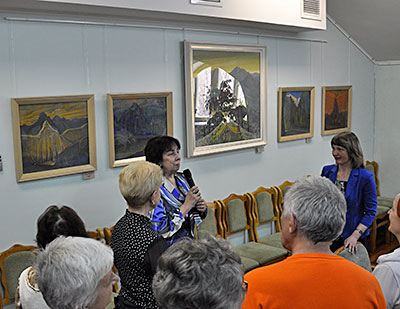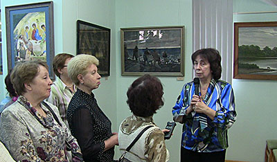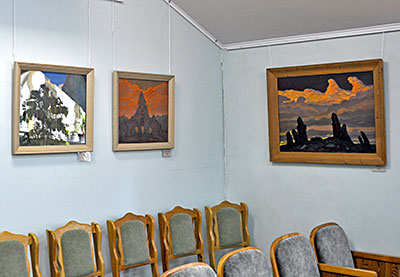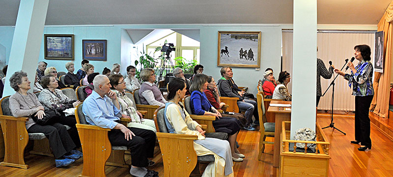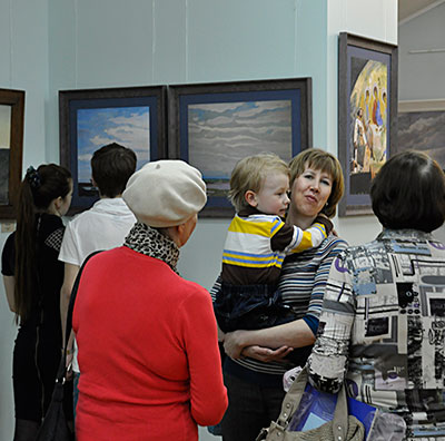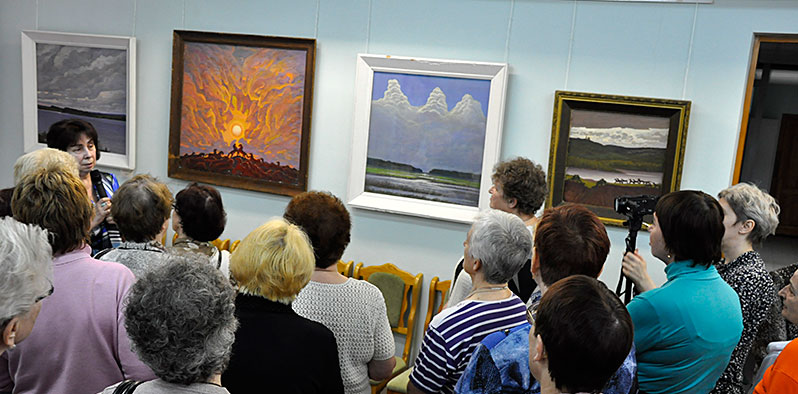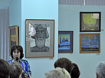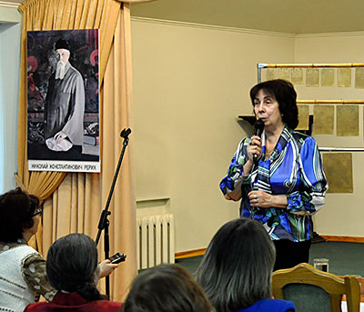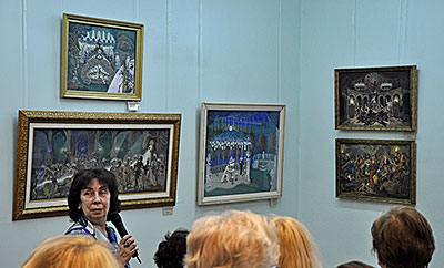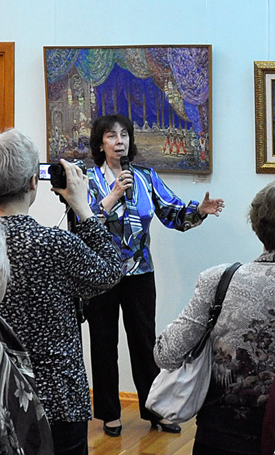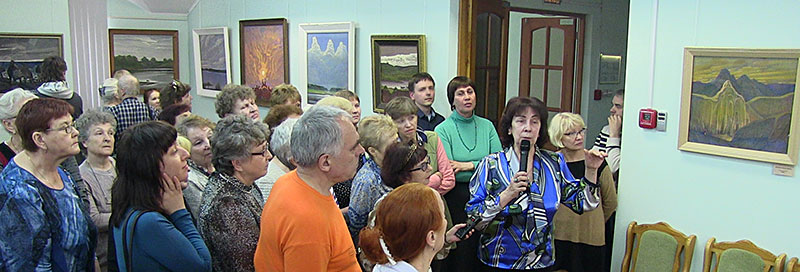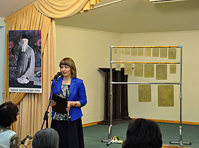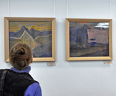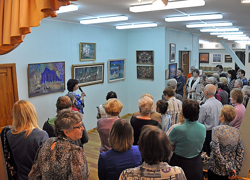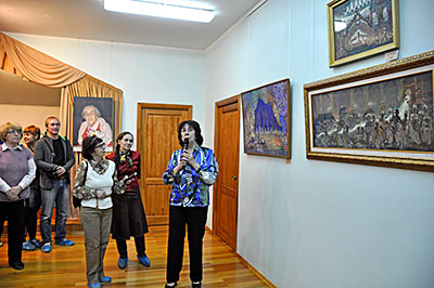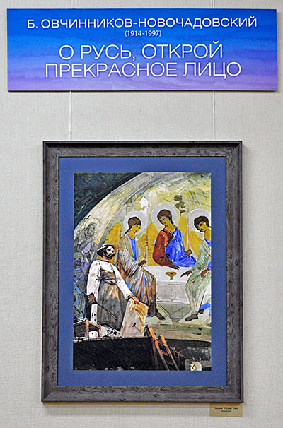 25 апреля в Музее Н.К. Рериха открылась выставка картин Бориса Александровича Овчинникова-Новочадовского «О Русь, открой прекрасное лицо». В экспозиции — тридцать девять произведений, шесть из них — репродукции. Они разнообразны по жанру — пейзажный, бытовой, портретный — и по технике: масло, темпера, пастель, уголь. Среди работ художника как станковая, так и декорационная живопись — более тридцати лет творчества он посвятил театру, создавая эскизы декораций и костюмов для спектаклей. Экскурсию по выставке провела дочь художника, Анна Борисовна Овчинникова-Новочадовская, а со сцены и перед открытием, и в дальнейшем во время рассказа звучали удивительно нежные и гармоничные звоны — особенный звук древнего инструмента «билы». Владеет этим инструментом Влада Якупова — замечательный музыкант, прошедший многолетнюю школу игре на колоколах во многих храмах России.