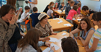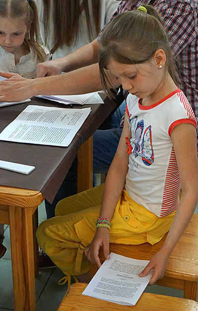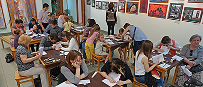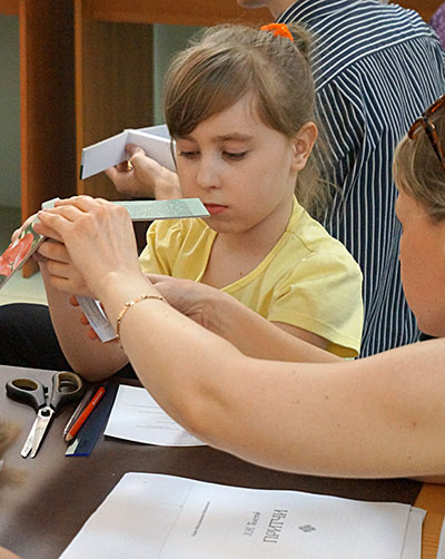 Мастер-класс Алексея Цыганкова по изготовлению книги занял четыре часа. Младшие участники немного утомились, однако высидели до конца наравне со взрослыми и результатом были довольны. Ещё бы, ведь они собственными руками изготовили настоящую толстую книжку в твёрдом переплёте с золотистыми буквами.