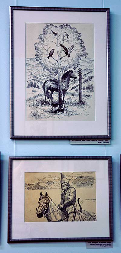 В работах М.П. Чевалкова динамично переданы военные сцены пазырыкской и древнетюркской эпох, достоверно изображены виды оружия того времени.