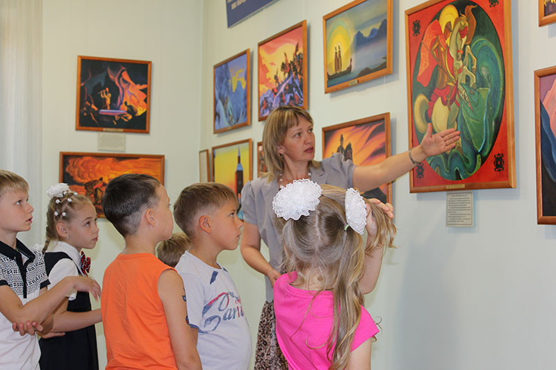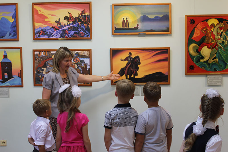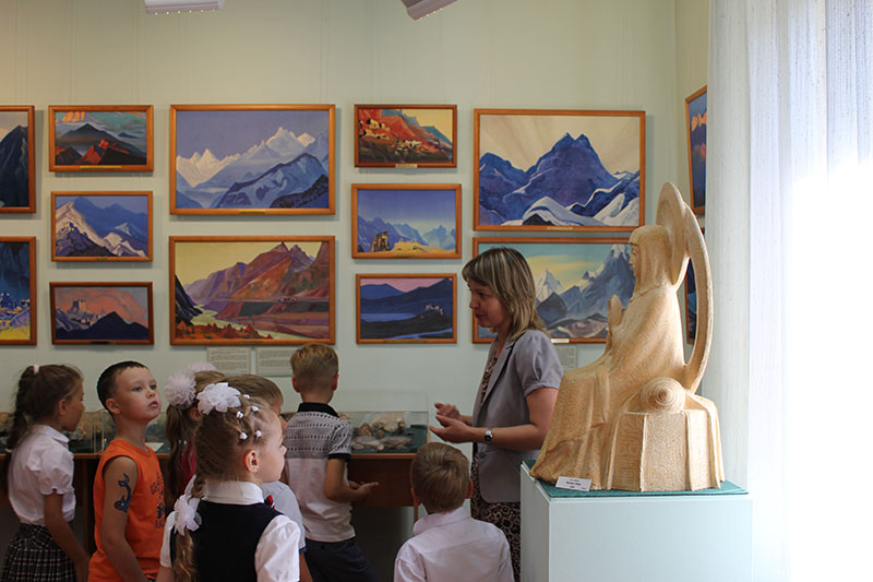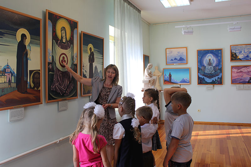 Давайте снова вспомним наши мудрые сказки. Как королевич Елисей оживил мёртвую царевну? Силой любви. Любовь — самая могучая сила. Те волшебники, которые живут за высокими горами, очень добрые и всех любят. Любовь даёт им силу совершать чудеса. Но почему же они скрываются за высокими горами? Почему скрывают от людей свои знания? Потому что мало любви среди людей. Потому что люди воюют и убивают друг друга. Если эти знания попадут к какому-нибудь злодею, на что он их употребит? На то, чтобы сделать какое-нибудь самое разрушительное оружие и стать властелином мира. Но когда на земле прекратятся войны, эти знания будут открыты людям. Представляете, какую счастливую жизнь можно будет тогда устроить на Земле? Даже в пустынях будут цвести сады. Не будет никаких болезней, люди будут жить мирно и дружно. Святой Сергий Радонежский (рассказ у репродукции одноимённой картины Н.К. Рериха). Он один из таких людей, которые силой своей огромной любви творят чудеса, помогают многим людям. Он держит в руках храм. Это наша Родина — Россия. Он её охраняет…» Юные посетители проявили большую активность и ответили на разные вопросы экскурсовода, так, у картины «Заморские гости» они самостоятельно определили, что на ладьях плывут викинги, добавив при этом, что они добрые. На вопрос, почему же мудрецы-волшебники, которые живут высоко в горах, не раскрывают людям все свои знания, дети ответили, что знания могут быть направлены людьми на зло. А Матерь Мира закрыла своё лицо, потому что на земле много войн и зла.