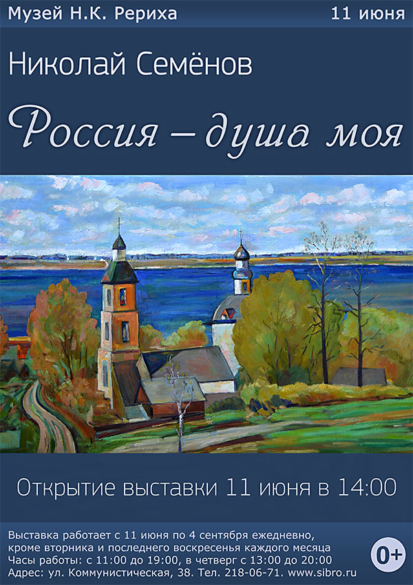 11 июня в Музее Н.К. Рериха откроется персональная выставка картин новосибирского художника Николая Семёнова. На выставке представлены картины о храмах России, о родной сибирской природе, знакомых и милых новосибирцам местах, о людях, сыгравших важную роль в становлении нашего города. Выставка будет работать до 4 сентября. Приглашаем на открытие выставки 11 июня в 14.00.