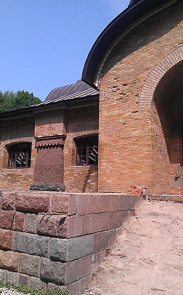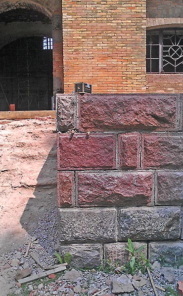 - Снаружи, вокруг храма, выбран грунт, усилен фундамент, уложен глиняный замок гидроизоляции (местами фундамент в земле был промазан битумом). Сверху заполнен колотым булыжником, просыпан песком. Почему не включили в проект нормальную гидроизоляцию — непонятно.
