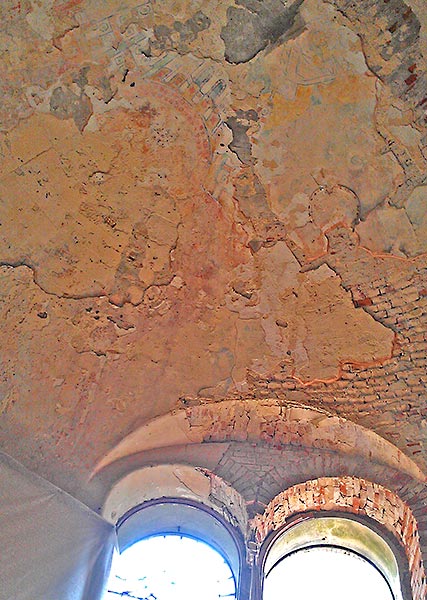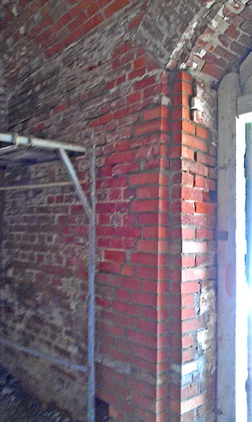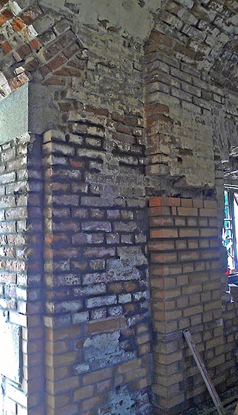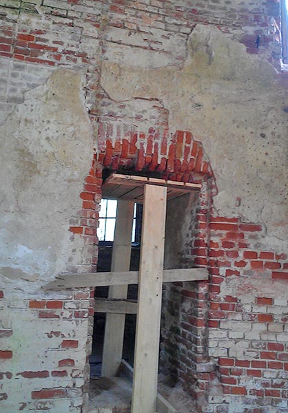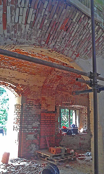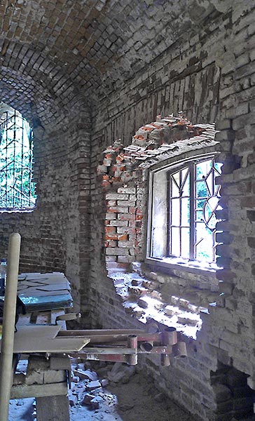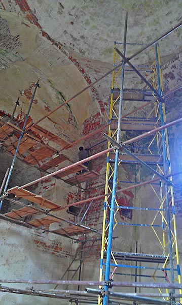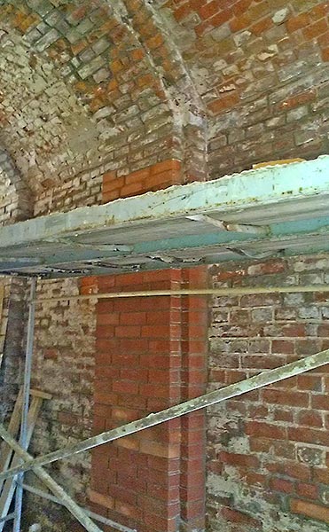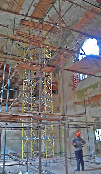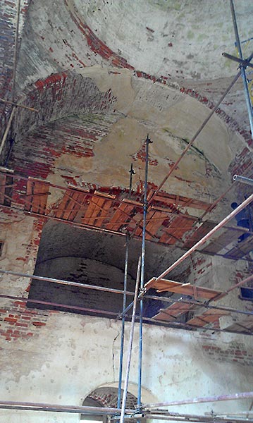 - Верхний этаж, внутренние стены (все, кроме алтарной части) зачищены, местами заменены сплошной кладкой, стыки обработаны, трещины прокачаны связующим раствором, полностью подготовлены под дальнейшее оштукатуривание.