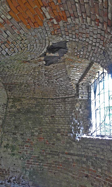 - Пол внутри вымощен кирпичом, но до первоначального вида будет ещё около 15-20 см не дотягивать. За долгие годы разобрали кирпич до самого свода подвала.