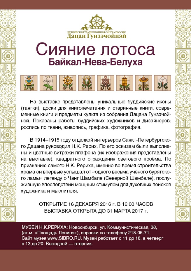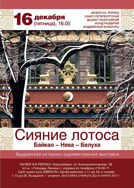 16 декабря в Музее Н.К. Рериха откроется историко-художественная выставка «Сияние лотоса. Байкал-Нева-Белуха». Выставка посвящена традиционному буддизму в многоконфессиональной России, истории духовной жизни первого в Европе, единственного на Северо-Западе буддийского храма – Санкт-Петербургского Дацана Гунзэчойнэй.