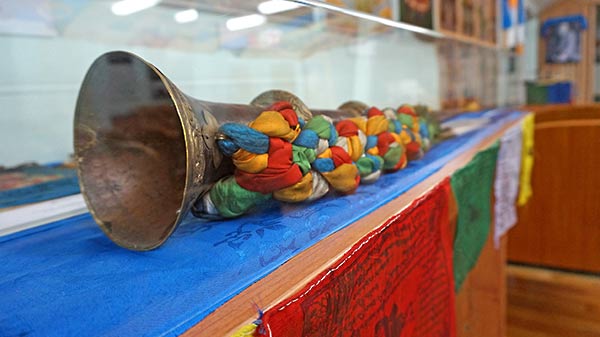 Выставка «Сияние Лотоса: Байкал – Нева – Белуха» из Санкт-Петербургского Дацана Гунзэчойнэй открылась для посетителей Музея Н.К. Рериха 16 декабря. На всю зиму и на первый весенний месяц третий этаж Музея преобразился и напоминает теперь настоящий буддийский храм. Алтарь со статуей Будды, танки со священными изображениями, над ними – специальные шарфы, хатаки. Под самым потолком – флажки с изображением Коня Счастья, такие же, какие мы можем увидеть на подступах к горным вершинам. Нашли своё место и витражи, выполненные по эскизам Николая Константиновича Рериха, и одежда с плеча главы российских буддистов. Все предметы несут не себе отпечаток тех энергий, с которыми они входили когда-то в соприкосновение.