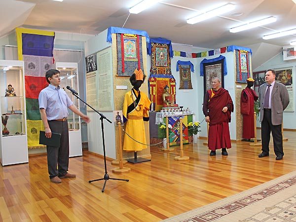 «Я очень рад открывать нашу выставку здесь, в Новосибирске, - отметил настоятель Санкт-Петербургского Дацана Б.Б. Бадмаев. - Цель этой выставки - ознакомление именно с традиционным буддизмом России. Особое место здесь представляет наш Санкт-Петербургский буддийский Дацан. В чем заключается его замечательность? В том, что буддизм на протяжении многих веков заслужил доверие наших властей, императора Николая II, и как результат этого доверия, понимания, что буддисты России служат именно своей родине, России, была разрешена постройка Санкт-Петербургского буддийского Дацана. Это результат деятельности всего огромного количества народа, огромного количества священнослужителей и их руководителя Пандито Хамбо-ламы, это их большая заслуга. И мы это хотим показать, чтобы вы знали, что наша Россия одинаково должна считаться также буддийской страной. Мы тоже по крупицам собираем нашу историю. Будем идти по этому высокому духовному, нравственному пути и достигать так называемого буддийского просветления. Мы видим, что, действительно, культура нас объединяет, многие-многие века она всех нас обогащает. Не только обогащает, она служит нам примером высокого духовного нравственного принципа, который заложен во всех религиях. И это нас всех объединяет».