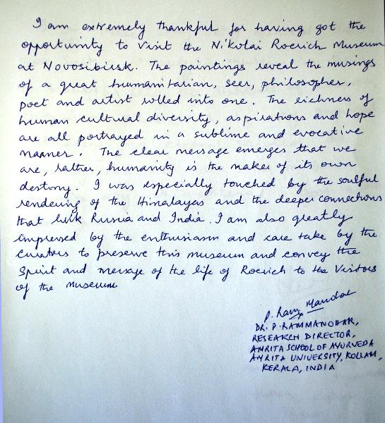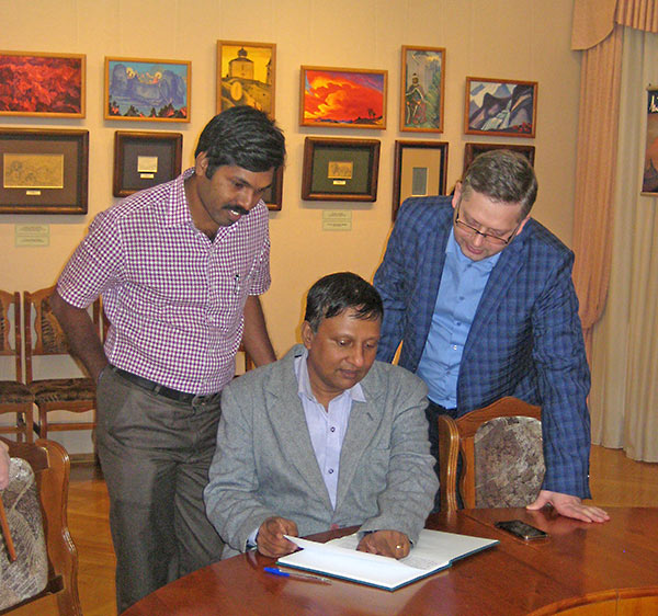 Посетители оставили свои комментарии в книге для почетных гостей и увезли с собой две репродукции картины Н.К. Рериха «Пантелеймон-целитель» и англоязычные издания подборки Н.Д. Спириной из Учения Живой Этики «Психическая энергия: накопление и расточение».