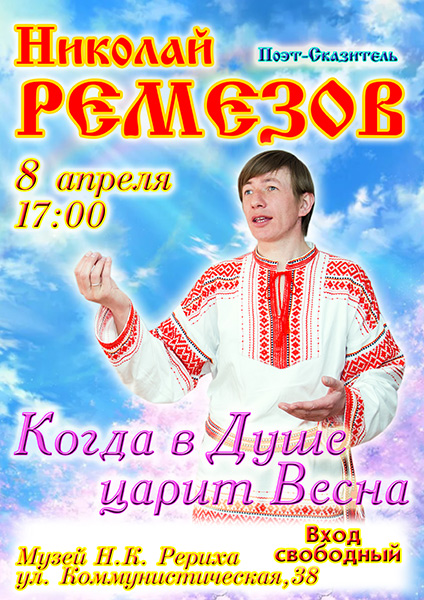 Николай Сергеевич Ремезов – Поэт-Сказитель, человек, который не перестаёт удивлять своей неуёмной натурой. Это и работа с детьми, и всевозможные проекты, и проведение традиционных народных праздников, и театральное мастерство, и хороводные игры, и участие во множествах мероприятий разных масштабов. И, конечно же, то, чем живёт его ДУША – ПОЭЗИЯ. Николай наделён редким сочетанием поэта и чтеца. Его творчество пронизано колоссальным позитивом, который начинает наполнять чашу сердца с первых слов.