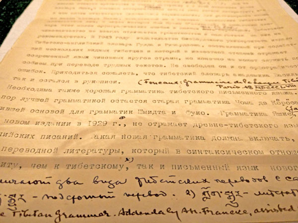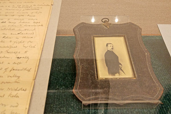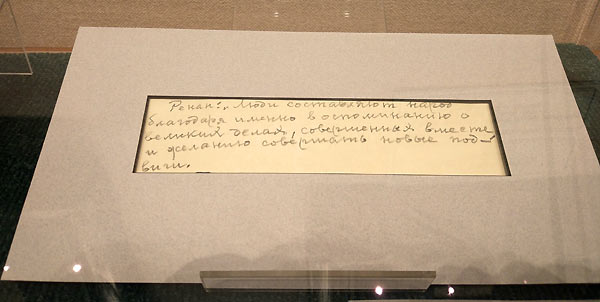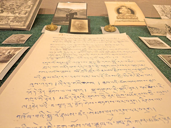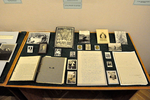 В Каминном зале Музея ещё несколько дней, до 18 октября, продлится выставка предметов, принадлежавших семье Рерихов, предоставленная к юбилею коллекционером из Москвы. Здесь оформленные в оригинальные рамки небольшие фотопортреты членов семьи Рерихов, а также отца Елены Ивановны, фотографии Маньчжурской экспедиции. Рядом - статьи и рукописи Юрия Николаевича на различных языках, отдельные записи Николая Константиновича, оформленные в паспарту, скоросшиватель с письмами. Кроме этого, в экспозиции представлены перстни и браслет Елены Ивановны Рерих.