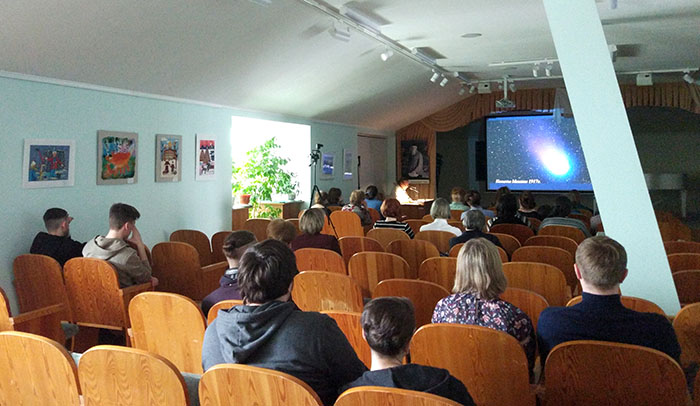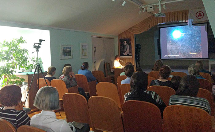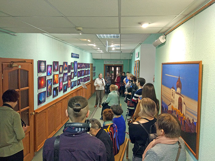 Наше издание полностью повторяет издание, впервые вышедшее в 1972 году в серии ЖЗЛ. Именно тогда, благодаря её выходу в свет, очень многие люди нашей страны открыли для себя имя великого художника и мыслителя Николая Константиновича Рериха, узнали о его жизни и творчестве. И до сего дня эта книга продолжает оставаться наиболее полной и достоверной биографией художника..."Экскурсия о Космосе началась на первом этаже, у звёздной выставки, и позже продолжилась в концертном зале как слайд-программа. После окончания выступления зрители обступили с вопросами нашего экскурсовода, Татьяну Георгиевну Шумееву (в прошлом – преподавателя физики и астрономии) и долго не отпускали.