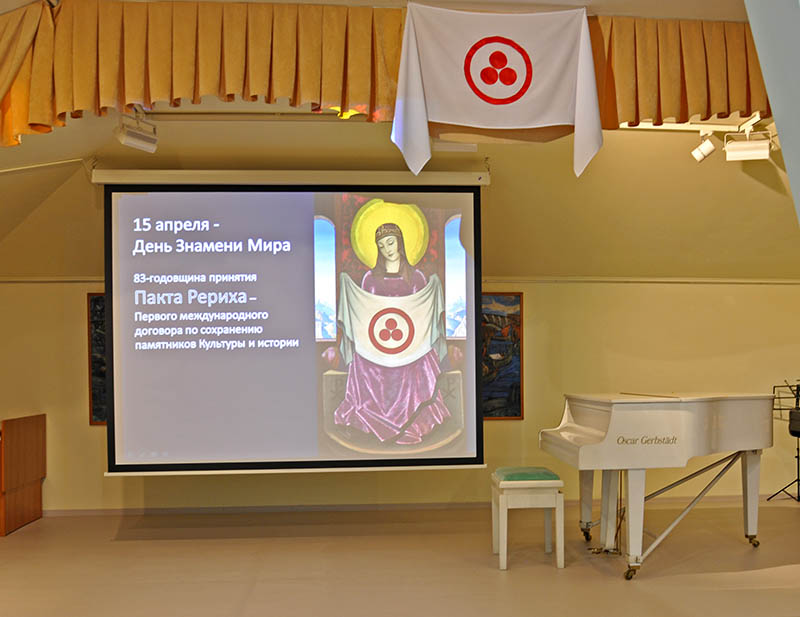 Встреча с гостями музея во вторую субботу апреля началась рассказом о Пакте Рериха и Знамени Мира. Завтра, 15 апреля, исполняется 83 года со дня подписания международного соглашения о защите учреждений, служащих целям науки и искусства, а также исторических памятников. Сергей Александрович Деменко коротко поведал историю этого международного миротворческого начинания и предложил к просмотру фильм студии Сибирского Рериховского Общества "Идите и храните Знамя".
