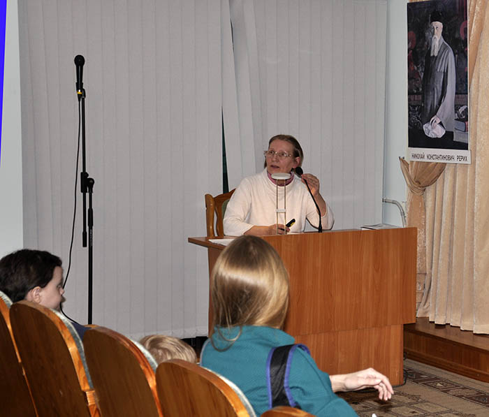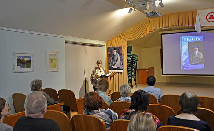 Редактор Издательского центра СибРО РОССАЗИЯ Наталья Михайловна Кочергина рассказала гостям музея о книге П.Ф. Беликова и В.П. Князевой «Рерих».