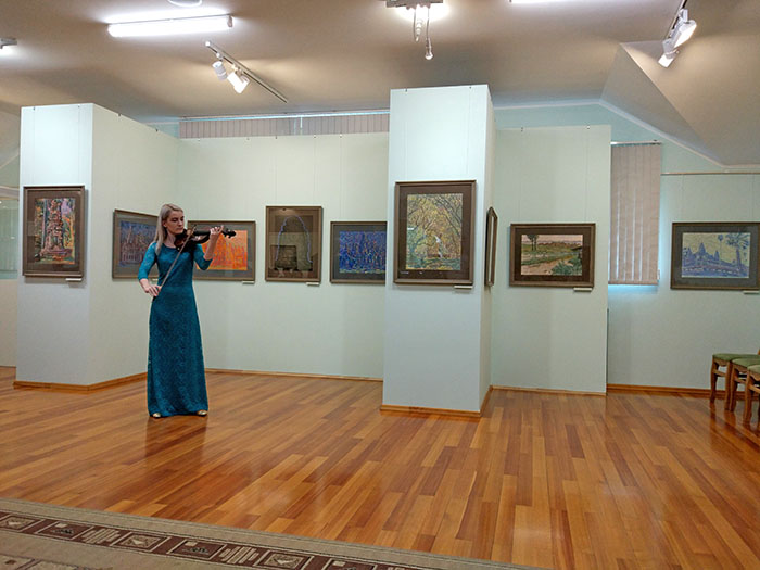Выставка Арсения Петровича Милованова открылась скрипичной музыкой. Как отметил сам художник, звучание скрипки и пастель с её фактурной техникой совпадают по тембру, обогащая и усиливая друг друга, и этот гармоничный союз благотворно влияет на нас — зрителей и слушателей. Студентка 1 курса Новосибирской специальной музыкальной школы –колледжа Лада Быченко исполнила музыку Иоганна Себастьяна Баха.