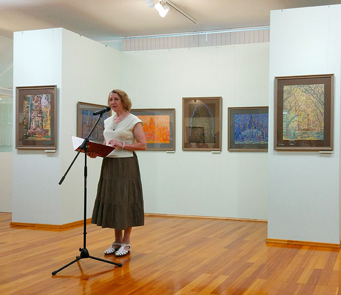 Убедительность, несомненно, присутствует в выставленных работах. Ведь они создавались там, в юго-восточной Азии. Они переносят нас на полуостров Индокитай, в Таиланд и Камбоджу. Камбоджа славится своим культурным достоянием — известным во всём мире храмовым комплексом Ангкор-Ват, возникшем в глубокой древности, во времена Кхмерской империи.