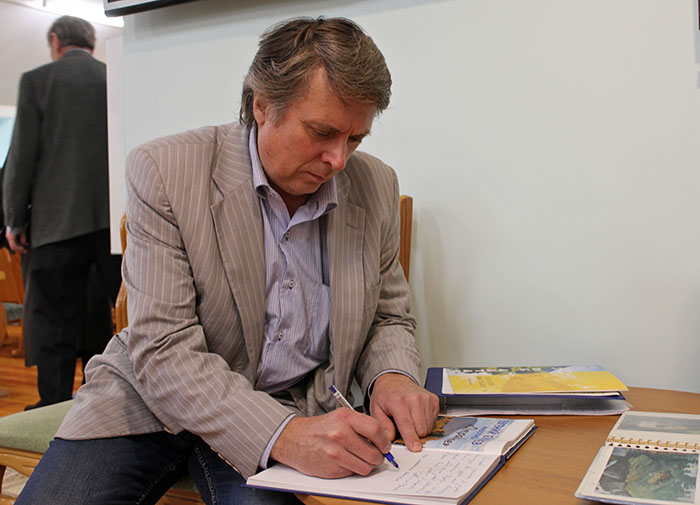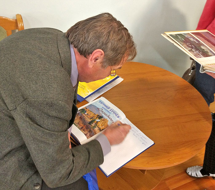 Выставка его работ проходит у нас впервые, и познакомиться с творчеством Евгения Васильевича, встретиться с самим художником захотели многие. Поддержать и поздравить «виновника торжества» пришли его друзья.