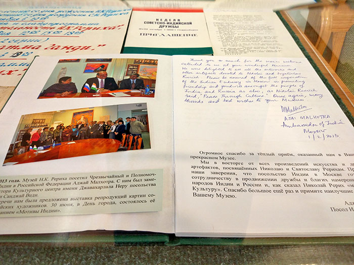 Тепло прошло общение с коллективом музея. В книге отзывов Аджай Малхотра оставил запись, в которой, в частности, было сказано: “Примите наши заверения в том, что посольство Индии в Москве готово к сотрудничеству в продвижении дружбы и благих намерений среди народов Индии и России и, как сказал Николай Рерих, «мира через Культуру». Спасибо большое ещё раз и примите наилучшие пожелания Вашему Музею”.