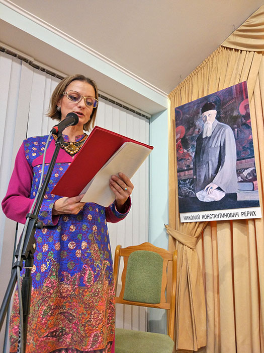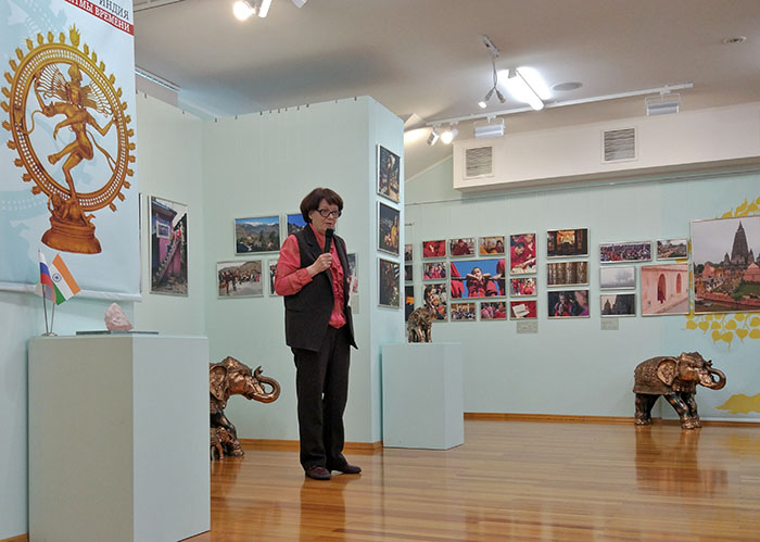 Один из кураторов выставки, руководитель выставочного отдела Музея Н.К. Рериха Людмила Толстихина в своём выступлении рассказала об истории дружбы Сибирского Рериховского Общества с Индией: