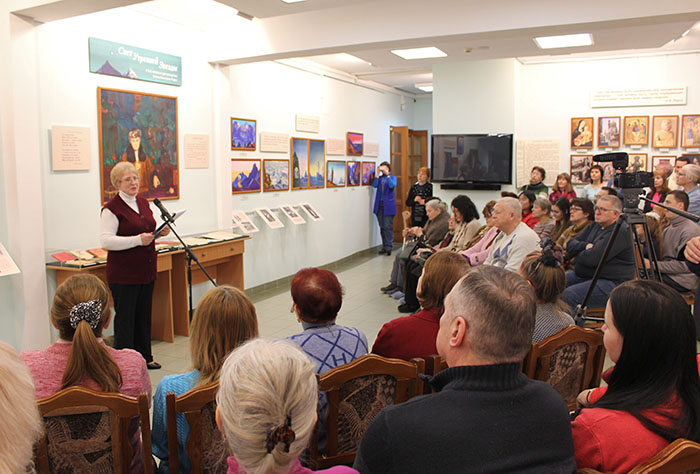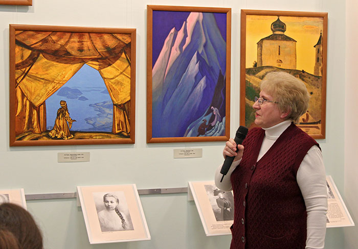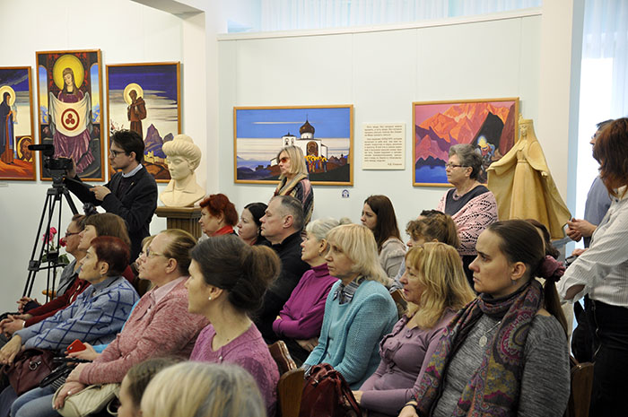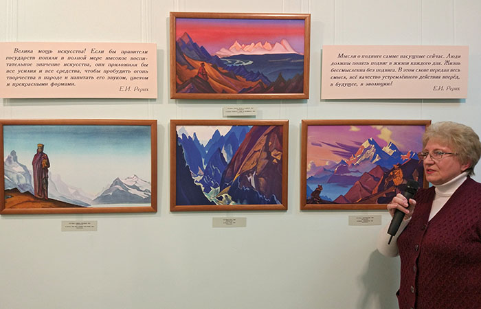 «Начнём с небольшого вступления о происходящем сейчас в мире, потому что вся деятельность Елены Ивановны и всей семьи Рерихов была связана именно с этими событиями. Они отмечали, что время, в котором мы живём, очень непростое. Мир захлестнули катаклизмы, постоянные кризисы, из которых человечество не может найти выхода, войны, преступность — всё это они связано с падением культуры, с тем, что человечество забыло об основах нравственности, в результате чего «мир сотрясается от грубости и жестокости».