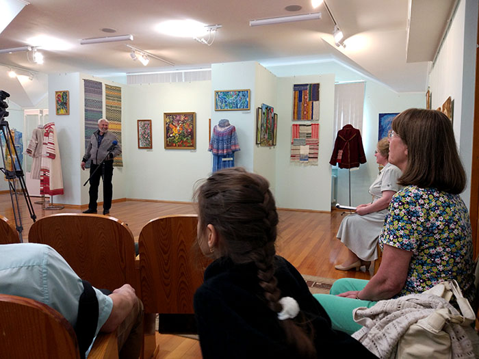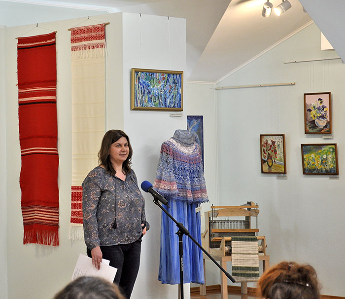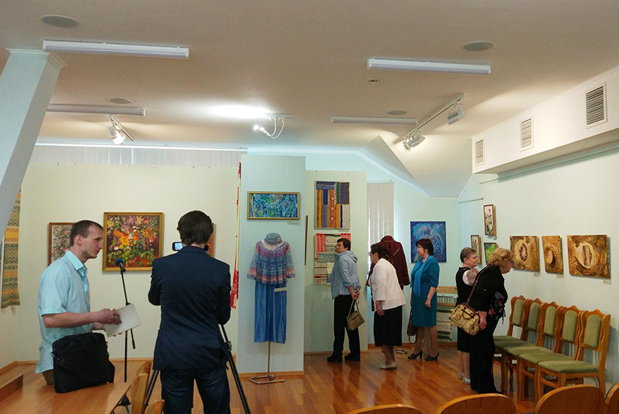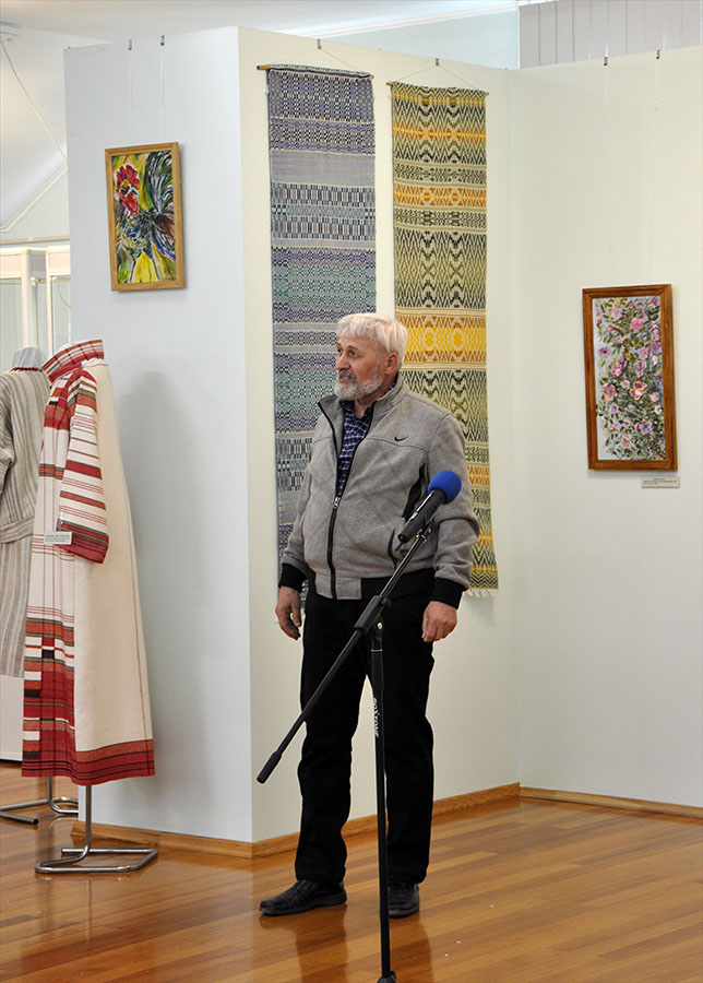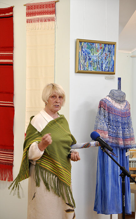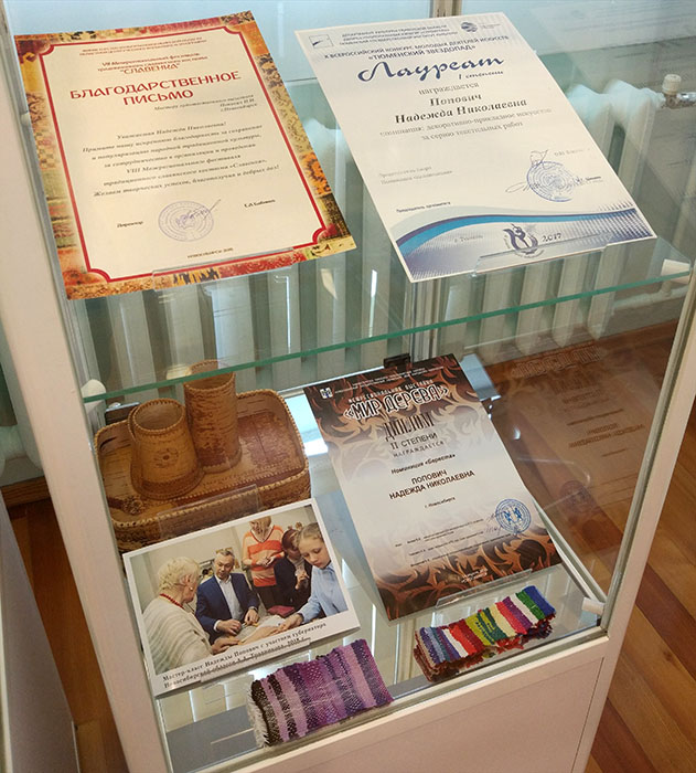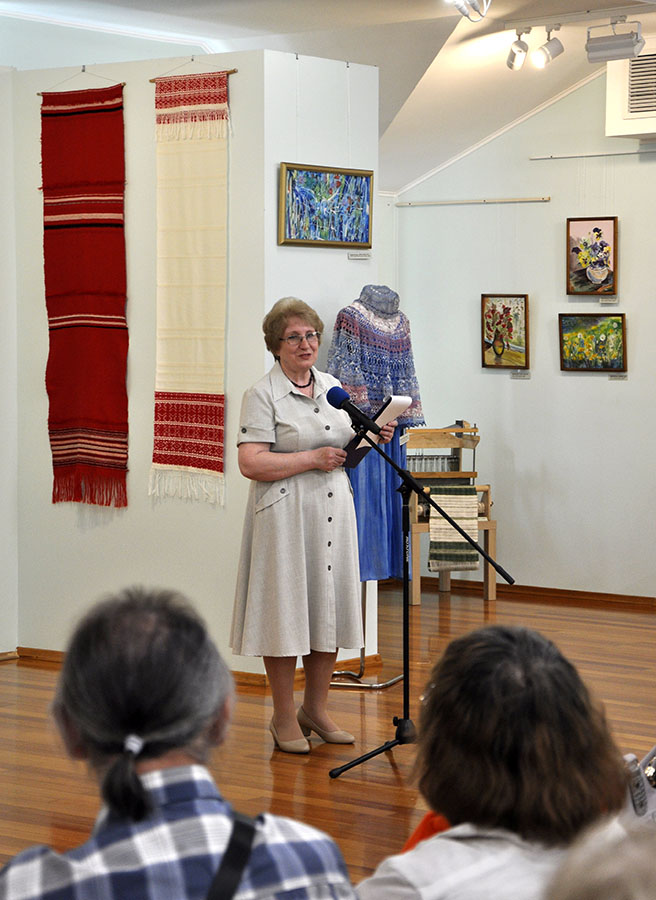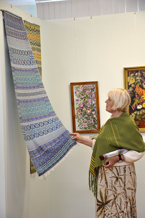 Надежда Николаевна Попович последние годы увлекается ткачеством - с некоторыми её работами зрители познакомились на выставке. Это палантины, полотенца, салфетки, одежда. Здесь же и ткацкий станок мастера. Надежда Николаевна проводит мастер-классы, обучая ткацкому делу. В старину в нашей стране этим ремеслом владела каждая женщина.