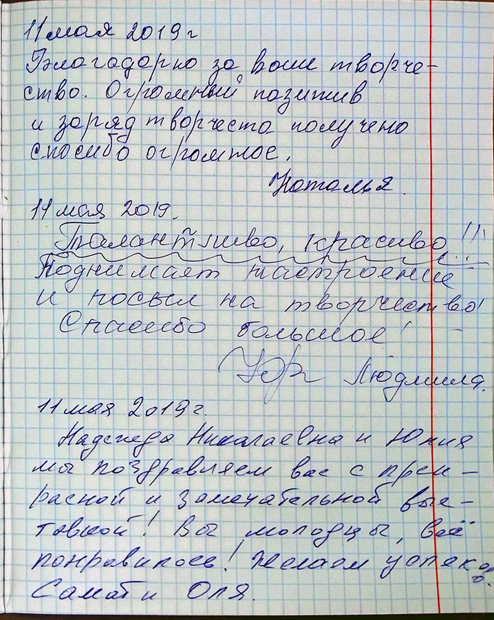 Выступая на открытии выставки, Н.Н. Попович призвала заниматься творчеством: «Людей неталантливых нет, есть просто ленивые». Она поблагодарила сотрудников музея за трепетное отношение к творческим людям.