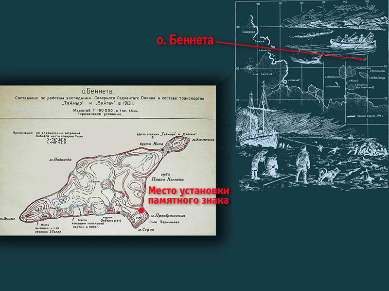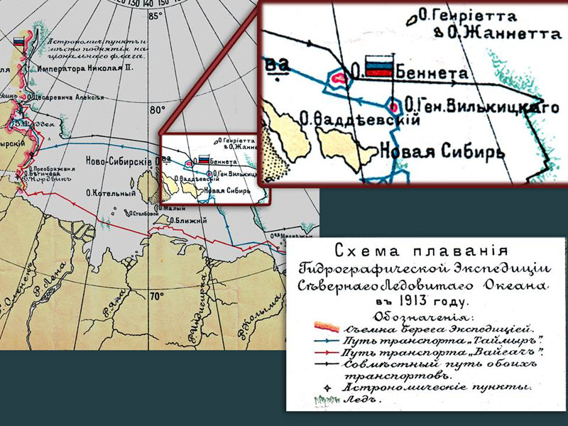На обратном пути команды высадились на остров Беннета, чтобы забрать коллекции, собранные русским полярником Эдуардом Толлем и его тремя спутниками. По всей вероятности, они погибли на этом острове в 1902 году. На острове были найдены не только коллекции, но и записи, в которых они сделали подробное описание острова. Экспедиция Вилькицкого установила, что Земли Санникова, которую так упорно искал Эдуард Толль, не существует. В память о погибших таймырцы установили на острове крест с их именами.