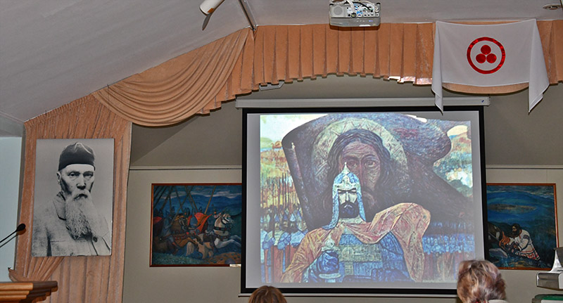 ...В эти дни мы обращаемся к истокам нашего государства и к тем грозным событиям, когда решалось: быть или не быть русскому народу. Куликовская битва - один из таких решающих моментов в истории Руси. В Музее Н.К. Рериха ко Дню Единства был показан слайд-фильм "На поле Куликовом". Перед его началом экскурсовод С.Р. Сапунков в небольшом вступительном слове сделал исторический экскурс в четырнадцатый век. В живых красках было показано, каково было тогда положение народа, который уже больше века находился под гнётом татаро-монгольского ига, о междуусобных войнах князей и их борьбе за ханский ярлык на господствующее княжение.