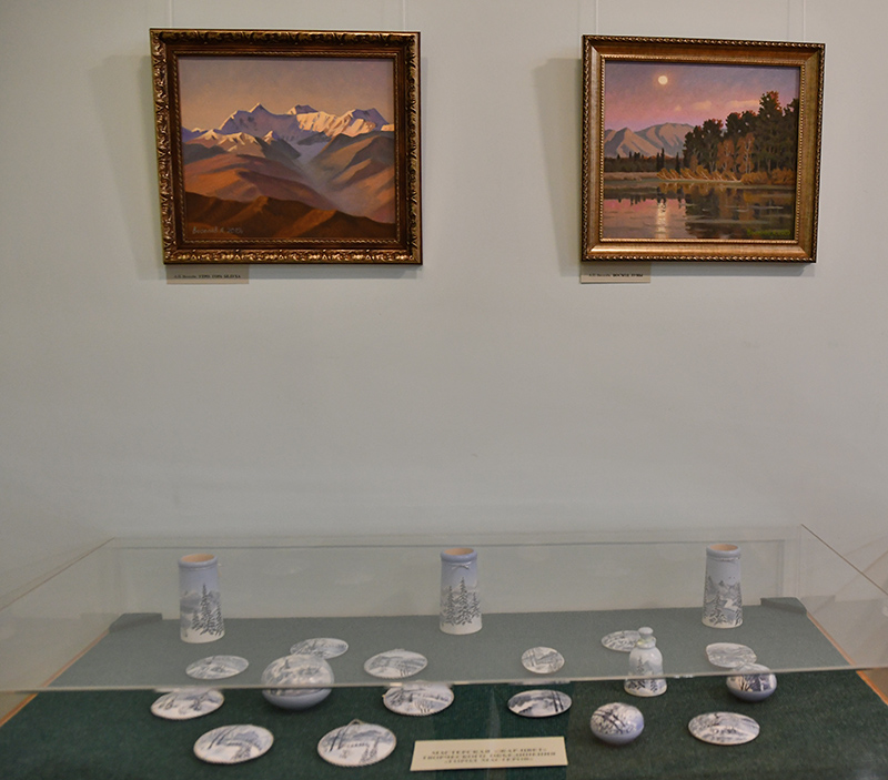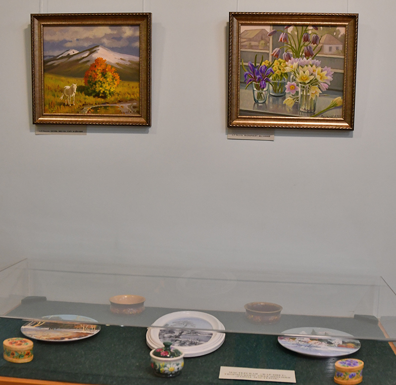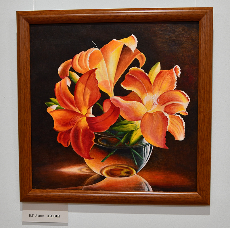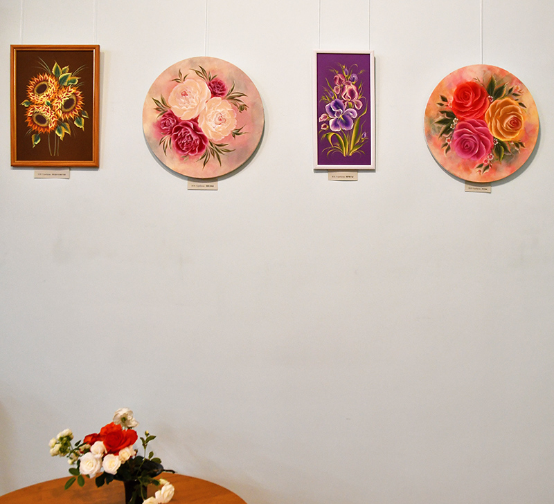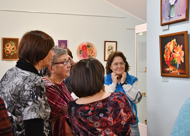 Среди представленных работ — картины А.П. Веселёва, персональные выставки которого уже проходили в Новосибирске, а также живописные цветочные композиции И.И. Серебровой, руководителя студии росписи, в которой занимаются дети и взрослые. Выставка дополнена расписными изделиями из дерева Н.С. Щербаковой, Т.М. Корнеевой и И.И. Серебровой.
