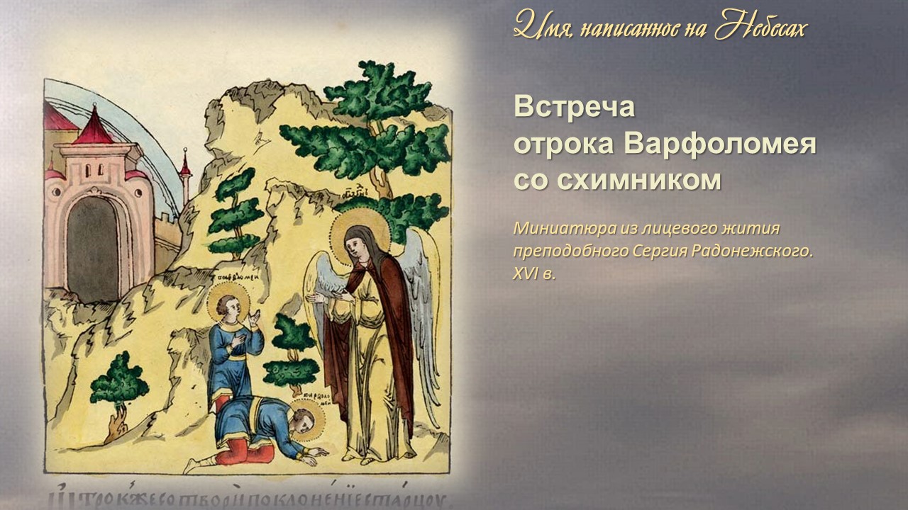 Однажды отец послал мальчика искать отбившихся жеребят. Он шёл полем и вдруг увидел под дубом святого обликом монаха, усердно молящегося. Варфоломей подошёл к нему и стал ждать конца молитвы. На вопрос «что тебе нужно, чадо?» Варфоломей сквозь слёзы рассказал ему о своём горе и попросил помолиться, чтобы Бог помог ему одолеть грамоту. Старец начал молиться, а вместе с ним — Варфоломей. Затем он дал мальчику кусочек просфоры и сказал, что отныне Бог даст ему разум в учении.