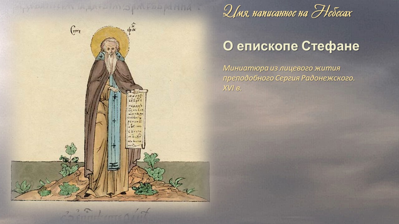 Однажды епископ Стефан следовал из Пермской епархии в Москву. На расстоянии 10 поприщ от Радонежской обители он остановился и приветствовал Преподобного. В это время в монастыре была трапеза. Сергий поднялся из-за стола, прочитал молитву и сказал: «Радуйся и ты, пастырь Христова стада, и мир Божий да пребывает с тобой!» Ученики удивились этому, а Сергий сказал, что он ответил епископу Стефану, который благословил всех их, и указал место, где это было. Некоторые монахи решили проверить, они догнали ехавших с епископом и удостоверились, что всё так и было.