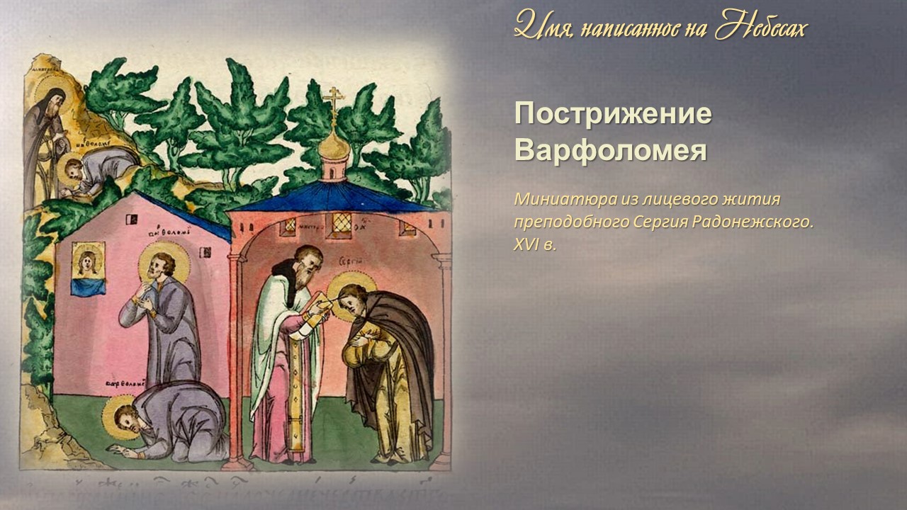 Варфоломей изучает монашеский устав. В 23-летнем возрасте в октябре, в памятный день святых мучеников Сергия и Вакха, игуменом Митрофаном он был пострижен в монахи и наречён именем Сергий. Люди, находившиеся в церкви во время его причастия, свидетельствовали, что церковь внезапно наполнилась благоуханием, и этот аромат был слышен и вокруг неё. Епифаний пишет, что в тот момент в новоявленного инока «вселилась благодать и дар Святого Духа».